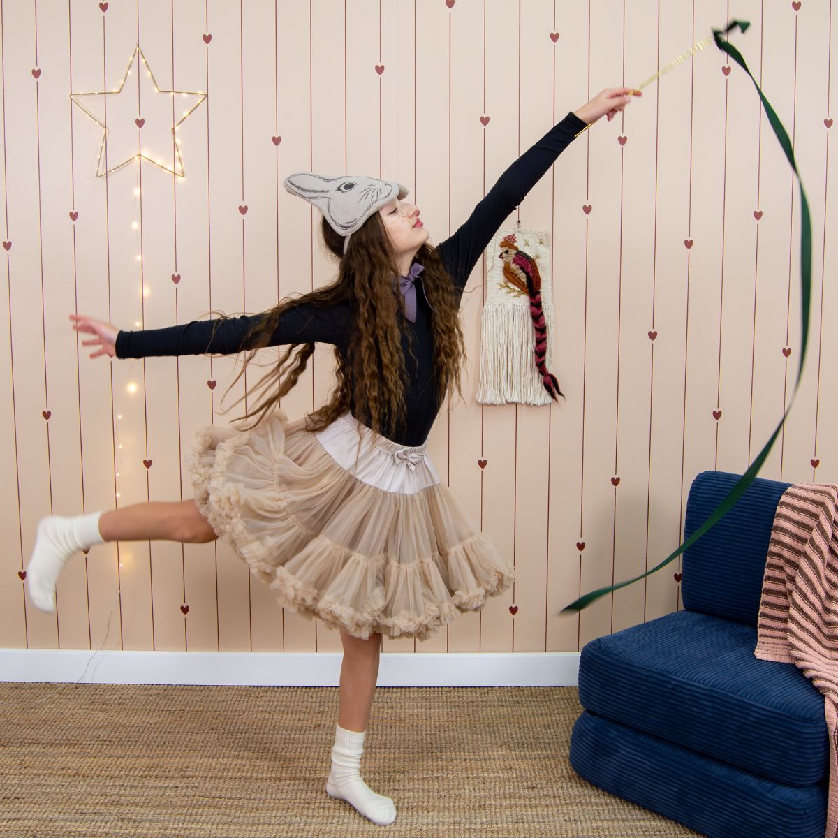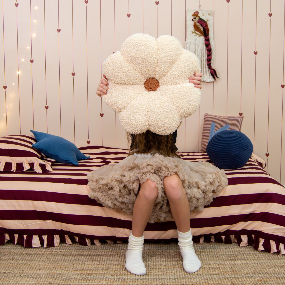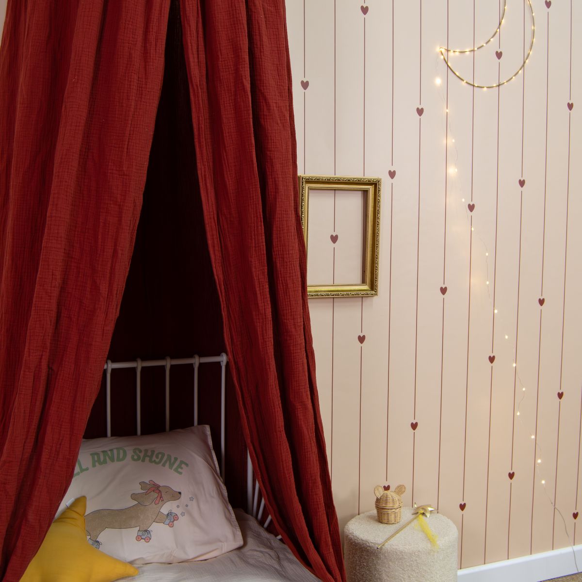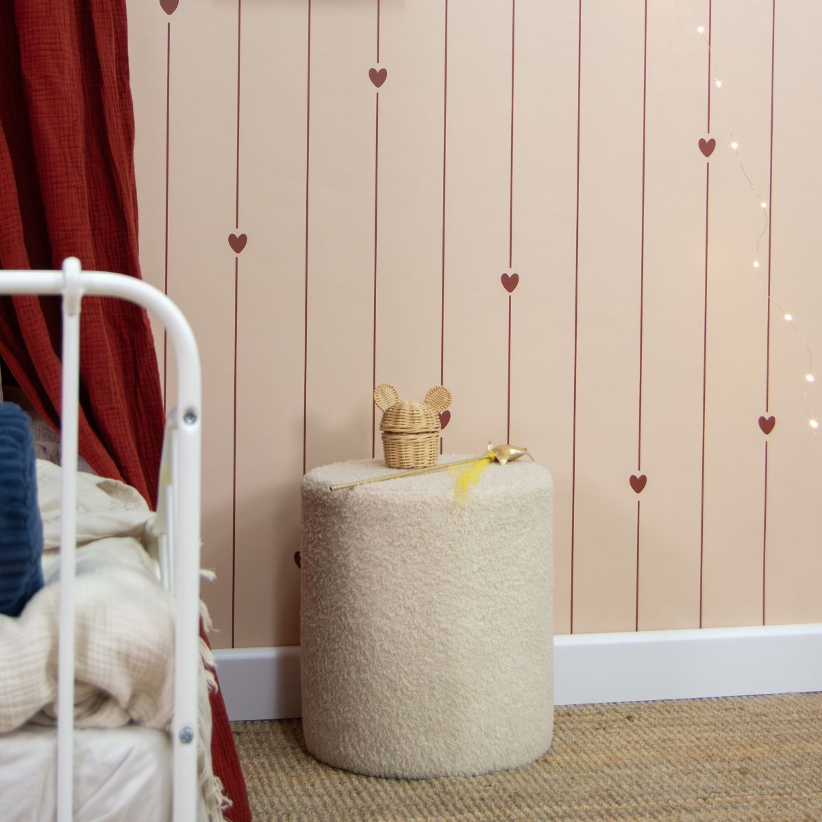 Tapeta w paski i serca doskonale komponuje się z meblami w stylu retro, jasnym drewnem oraz tkaninami w kolorach ecru, karmelu i bordo. Pięknie wygląda w towarzystwie lnianej pościeli, rattanowych dodatków i punktowego oświetlenia w stylu vintage, tworząc przytulne wnętrze w duchu skandynawskiej prostoty i romantycznego wdzięku.