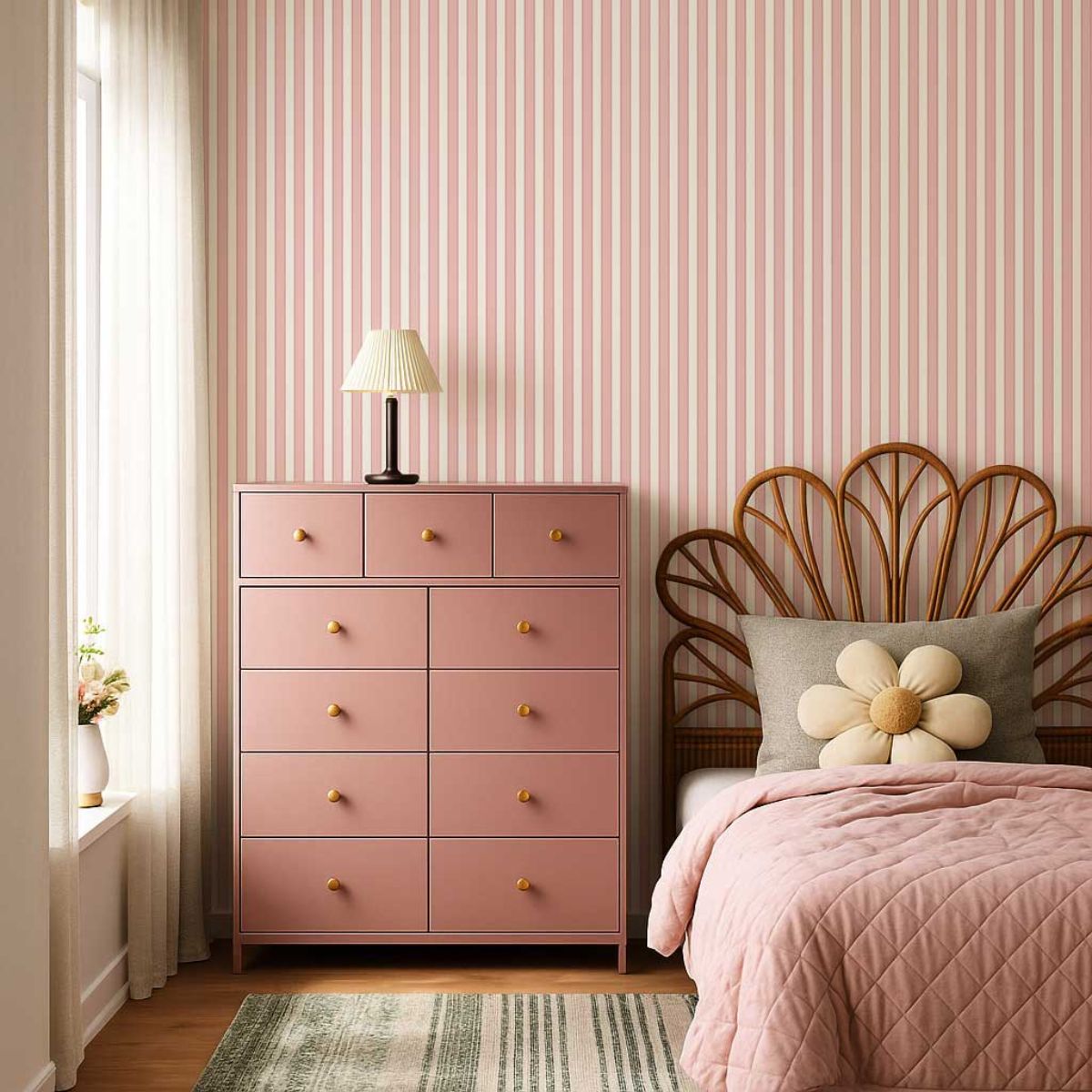 To idealna tapeta w paski do pokoju dziewczynki, która pięknie komponuje się z naturalnym drewnem, lnianymi tekstyliami oraz pastelowymi dodatkami. Dzięki prostocie i równemu rytmowi wzoru sprawdzi się także w sypialni lub w przestrzeniach inspirowanych naturą, tworząc przytulne i harmonijne wnętrze.