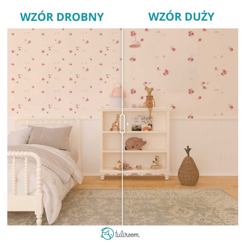 Możesz dokonać zakupu tapety w dwóch wariantach wielkości wzoru: wzór drobny oraz wzór duży. Różnią się one skalowaniem do podstawy wymiaru. Wzór drobny to skala 50cm podstawy, wzór duży to podstawa 100cm.