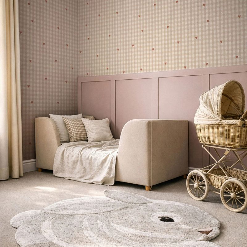 Precyzyjnie zaprojektowana kratka o szerokości 2,5 cm nadaje ścianom rytm, a drobne detale w postaci serduszek dodają całości miękkości. Możesz zdecydować się na wyeksponowanie jednej ściany jako eleganckiego akcentu lub pokryć wzorem większą powierzchnię, aby uzyskać efekt spójnej, otulającej oazy.