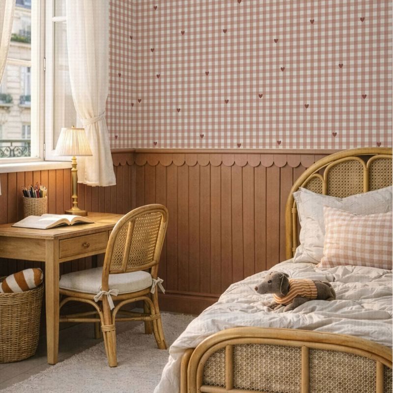 Tapeta w kratkę i serca terracotta – subtelna elegancja w stylu vichy