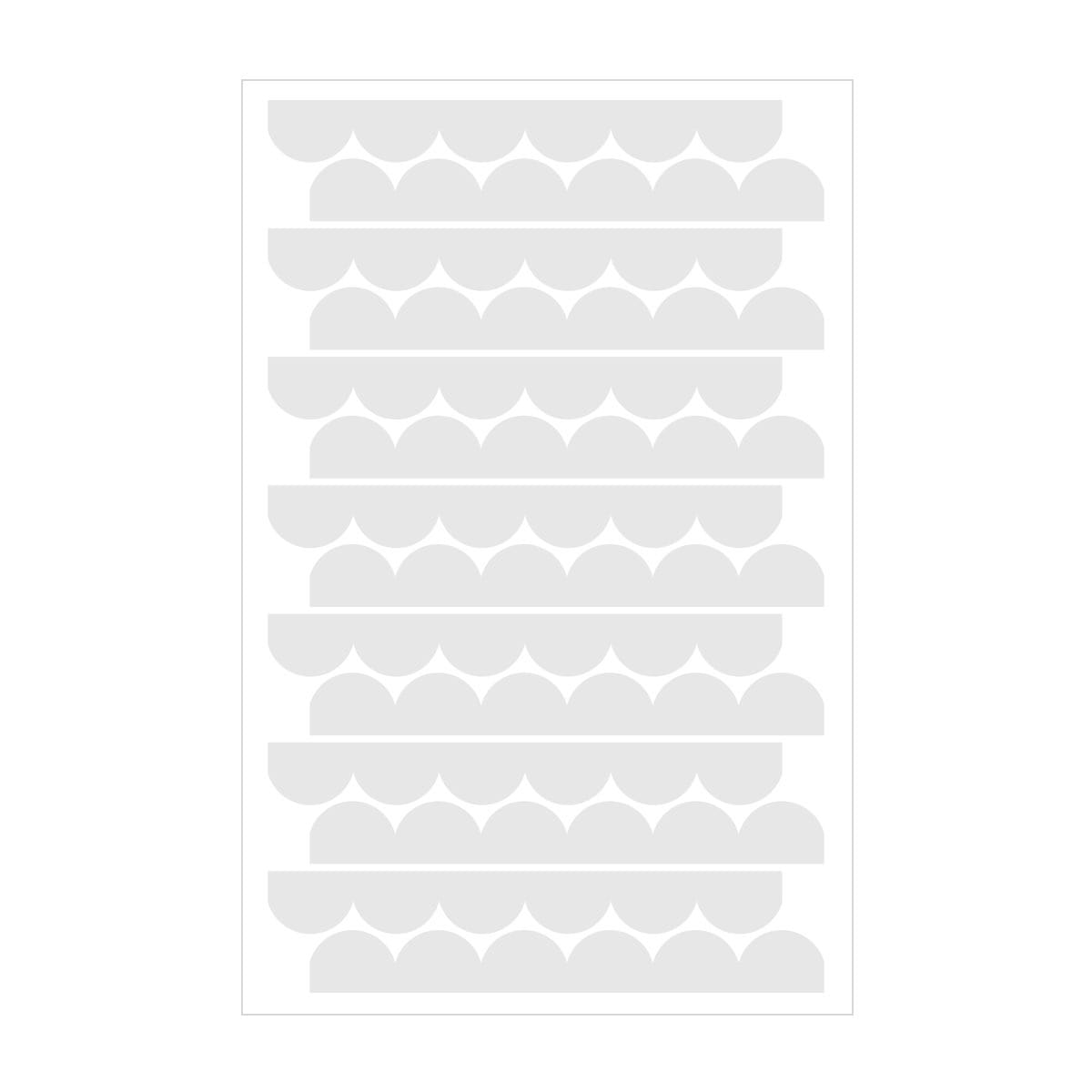 Półkola o średnicy ok. 9 cm, połączone w paski – tak, aby montaż był wyjątkowo łatwy. Nie za długie, nie za krótkie, bo mające ok. 55 cm, więc jedna osoba z łatwością da radę przykleić prosto, równo pasek za paskiem. Na szablonie mamy 14 takich pasków co daje nam ponad 7 metrów bieżących już po naklejeniu. Wystarczy to do przyozdobienia ściany w średniej wielkości pokoiku dziecięcym.