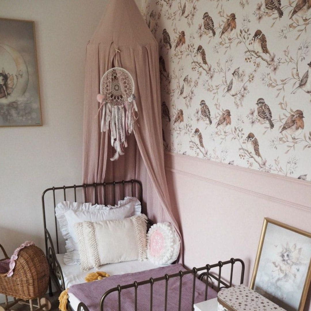 Cudowny wzór tapety dziecięcej tworzy delikatną, ale żywą plątaninę gałązek i ptaszków.Tapeta idealna do połączenia z rattanem, trochę w klimacie retro.