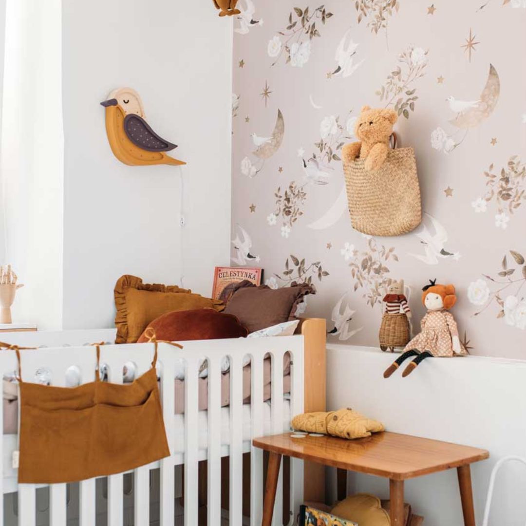 Tapeta Birds in the night sky to bardzo delikatny wzór, niezbyt gęsty i w delikatnych gustownych kolorach. Idealny nad kołyskę. Tworzy w pokoju atmosferę spokoju, snu, bajki.