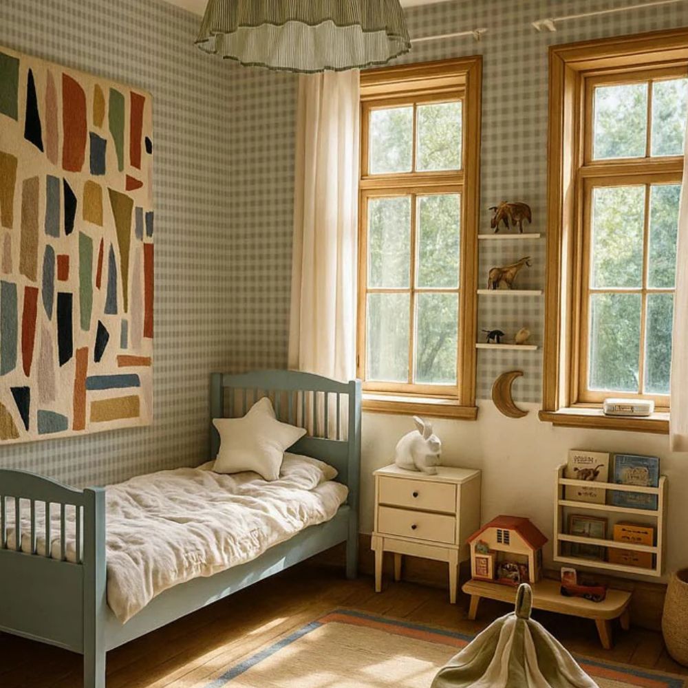 Dzięki swojej drobnej skali, tapeta w mini kratkę jest jednym z najbardziej wdzięcznych materiałów do aranżacji. Nie przytłacza wnętrza, lecz nadaje mu strukturę, stanowiąc perfekcyjną bazę dla pozostałych elementów wystroju: