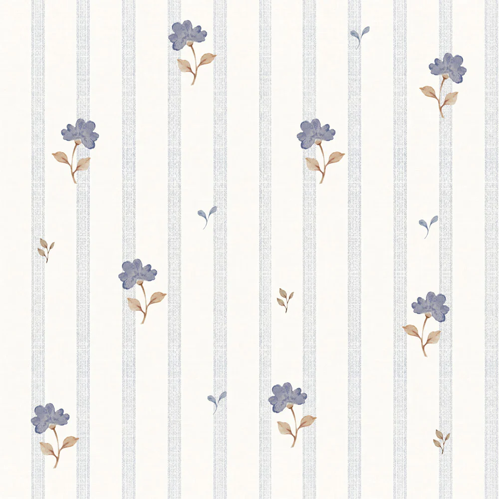 Subtelna tapeta w stylu retro z drobnymi, pastelowymi kwiatami to idealny wybór do pokoju dziecka. Delikatne niebieskie kwiatki połączone z cienkimi pionowymi paskami tworzą lekki, elegancki wzór inspirowany klasycznym stylem vintage. Stonowana kolorystyka sprawia, że tapeta wprowadza do wnętrza spokój i przytulną atmosferę.
