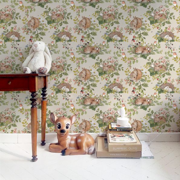 Tapeta do pokoju dziecka z uroczą ekipą zwierzaczków na na jasnym, beżowym tle to niebanalna propozycja na dekorację dziewczęcego wnętrza. Te cudowne stworzonka rozweselą każde pomieszczenie. Śpiąca sarenka, króliczek, wiewiórka oraz jeżyk w połączeniu z motywami roślinnymi to przepis na idealny pokój dziewczynki!