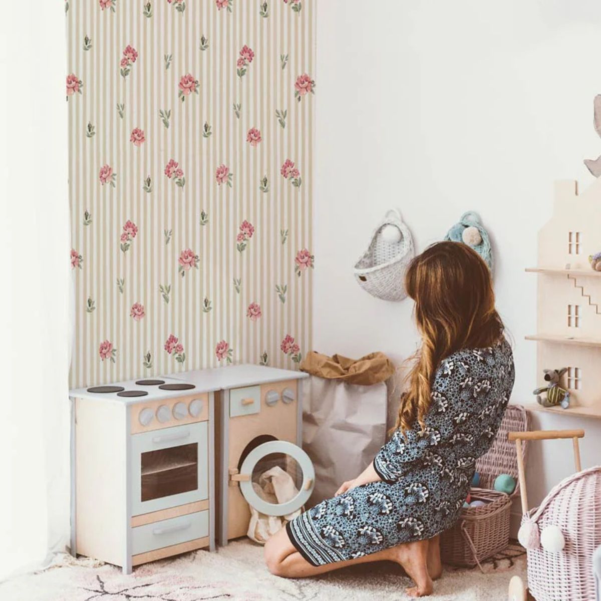 Wąskie pasy tapety (50 cm) gwarantują to, że tapetę dopasujemy prawie idealnie do szerokości ściany. A zapętlony wzór – każdy z pasów wygląda identycznie – sprawia, że elementy wzoru idealnie układają się na ścianie, jeśli kleimy tapetę od sufitu (oczywiście na ścianie bez skosów :). Dzięki temu nadwyżek materiału jest naprawdę niewiele.
