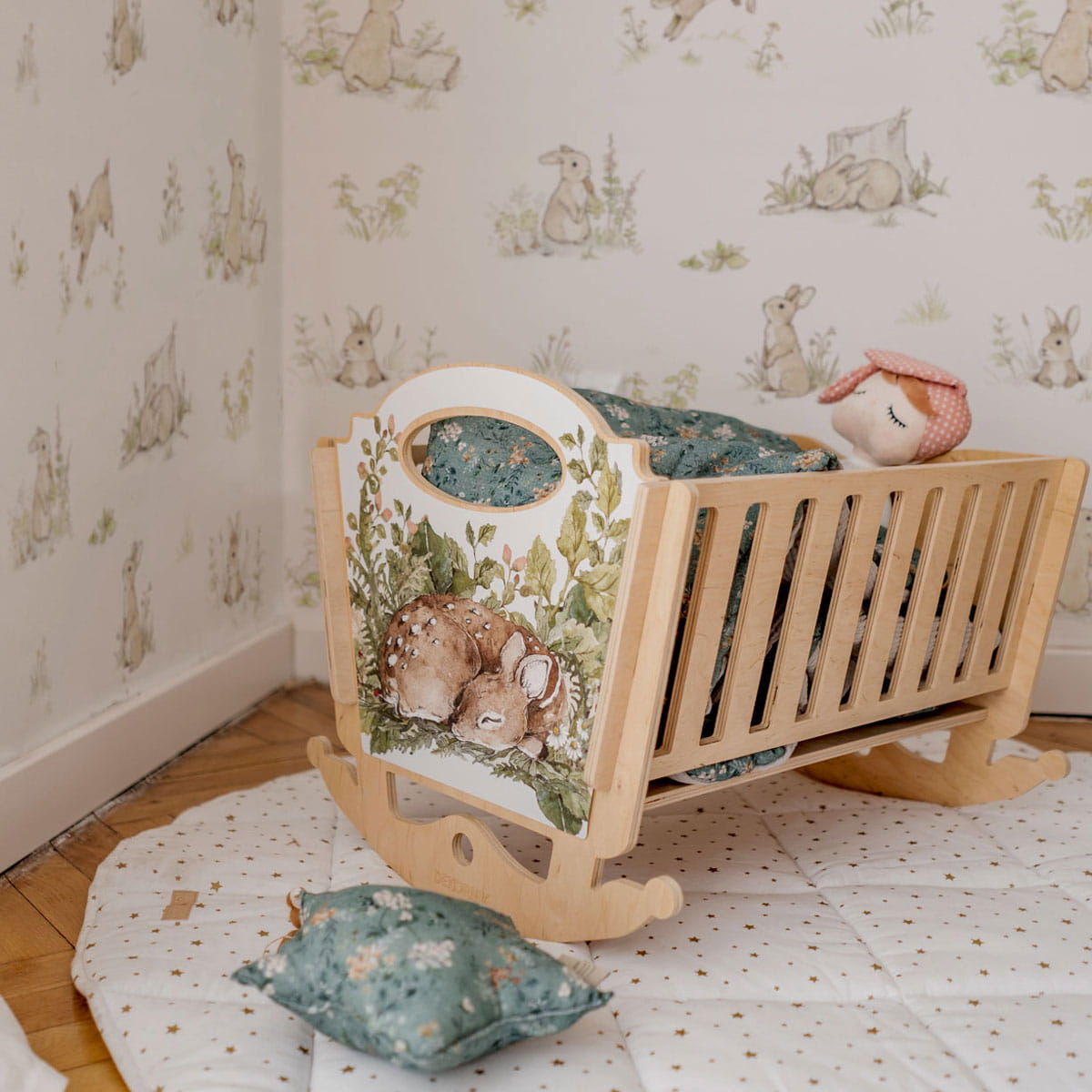 Tapeta do pokoju dziecka w słodkie króliczki stworzone przez Ewę Mąkę Nawojczyk to wersja brytyjskiego króliczka Petera.