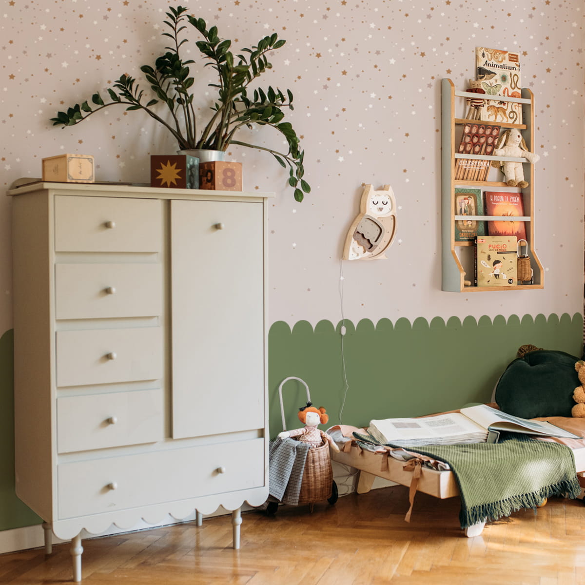 Tapeta w cudownie spadające gwiazdy! Wyobraźcie sobie łóżeczko dziecięce na ścianie z tą tapetą – deszcz magicznych gwiazdek delikatnie spływających z nieba.