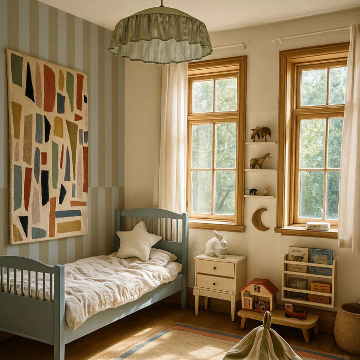 Tapeta w pasy w odcieniach delikatnego, zgaszonego błękitu oraz nieoczywistej, ciepłej zieleni to harmonijne połączenie, które świetnie współgra z naturalnym drewnem i jasnymi dodatkami, np. baldachimem. Dzięki swojej stonowanej kolorystyce sprawdzi się zarówno w minimalistycznych aranżacjach, jak i w tych bardziej odważnych, gdzie stanie się subtelnym tłem dla mocniejszych akcentów.
