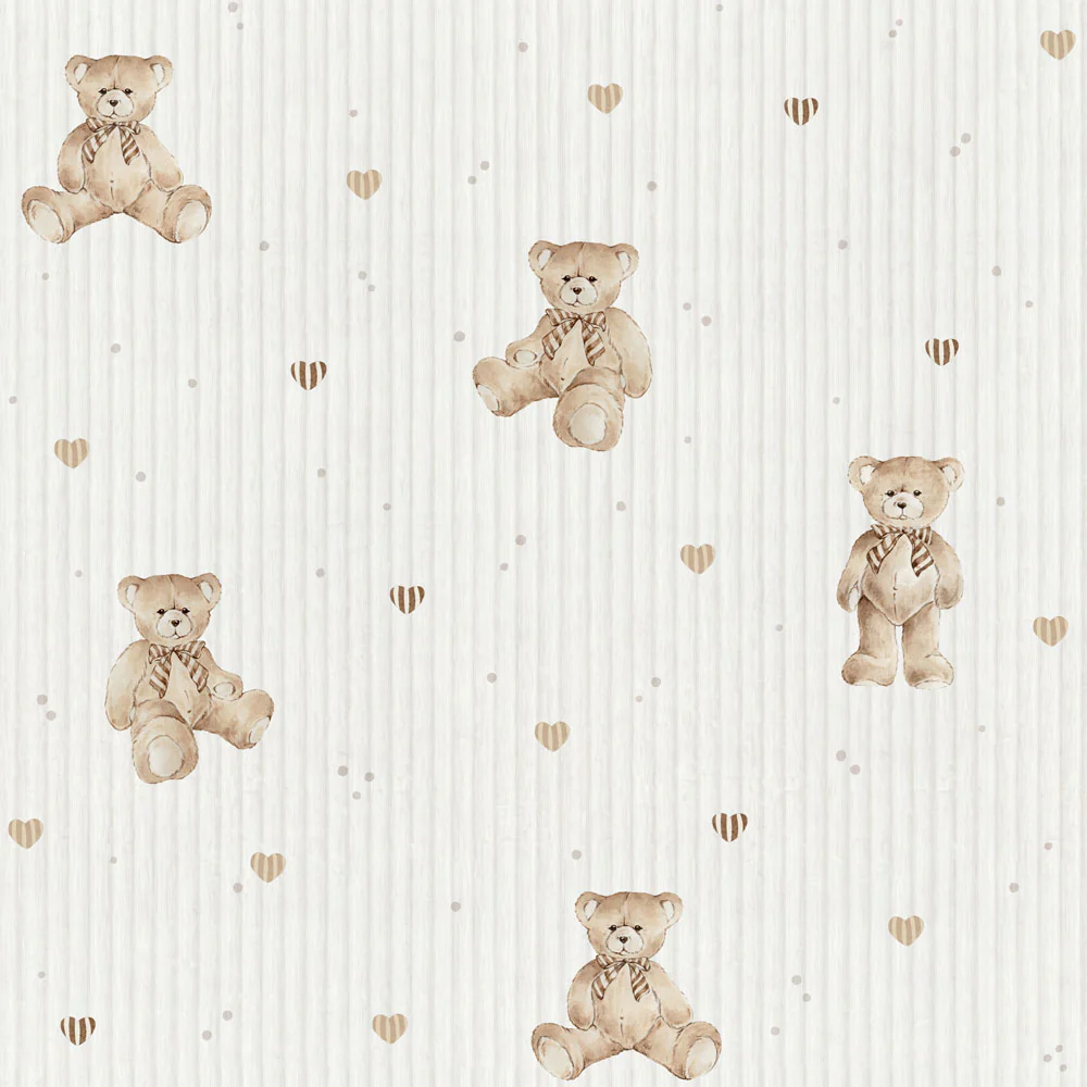 Urocza tapeta dziecięca z motywem pluszowych misiów to idealna dekoracja do pokoju niemowlaka lub małego dziecka. Na jasnym, subtelnie prążkowanym tle rozmieszczone są delikatne ilustracje misiów w ciepłych, beżowych odcieniach. Całość uzupełniają drobne kropeczki oraz małe serduszka, które dodają wzorowi lekkości i przytulnego charakteru.