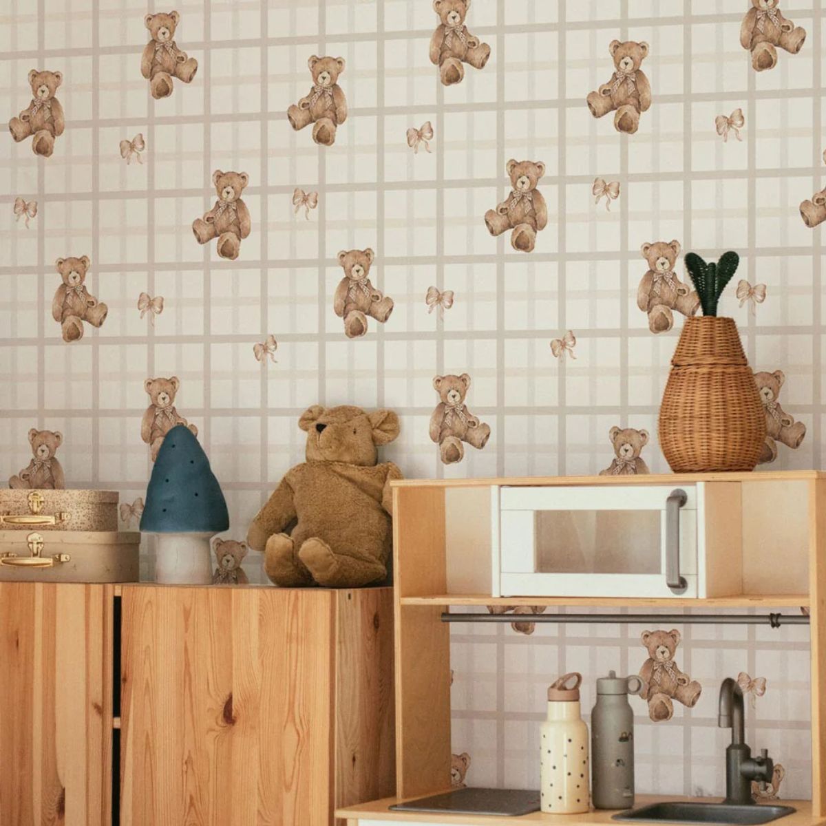 Coś naprawdę wyjątkowego – tapeta z uroczymi, vintage pluszowymi misiami na tle delikatnej kratki. To projekt, który łączy w sobie dziecięcy urok i klasyczny design, tworząc ponadczasową dekorację ściany do pokoju maluszka.