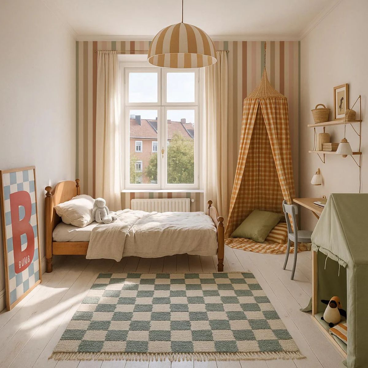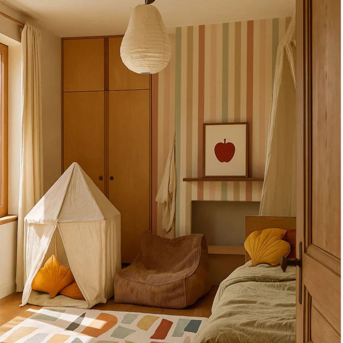 To idealny wybór do mniejszych pokoików – pasy optycznie porządkują przestrzeń, nie przytłaczając jej. Tapeta wprowadza ciepły, harmonijny nastrój i pięknie łączy się z naturalnymi dodatkami, drewnem i pastelami.