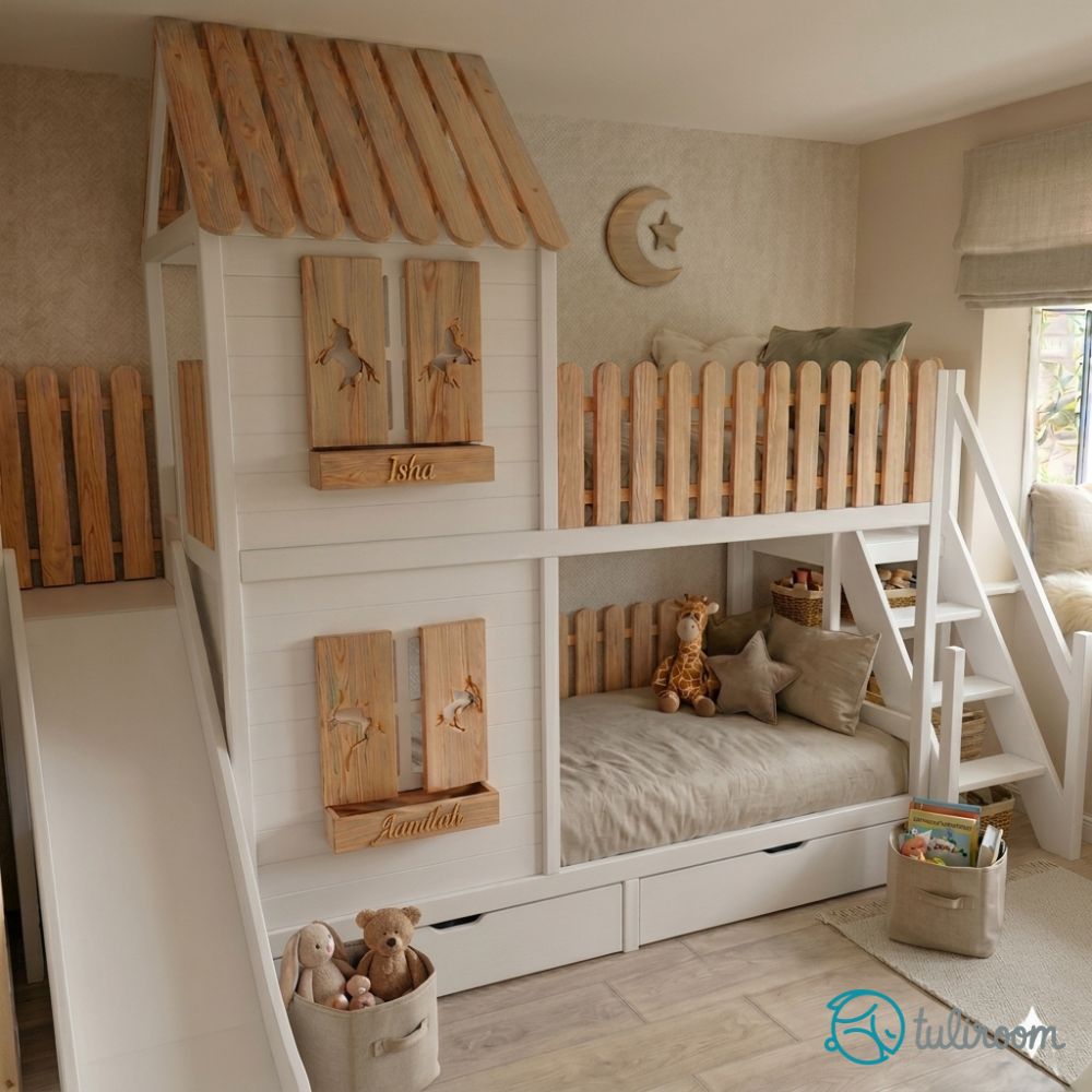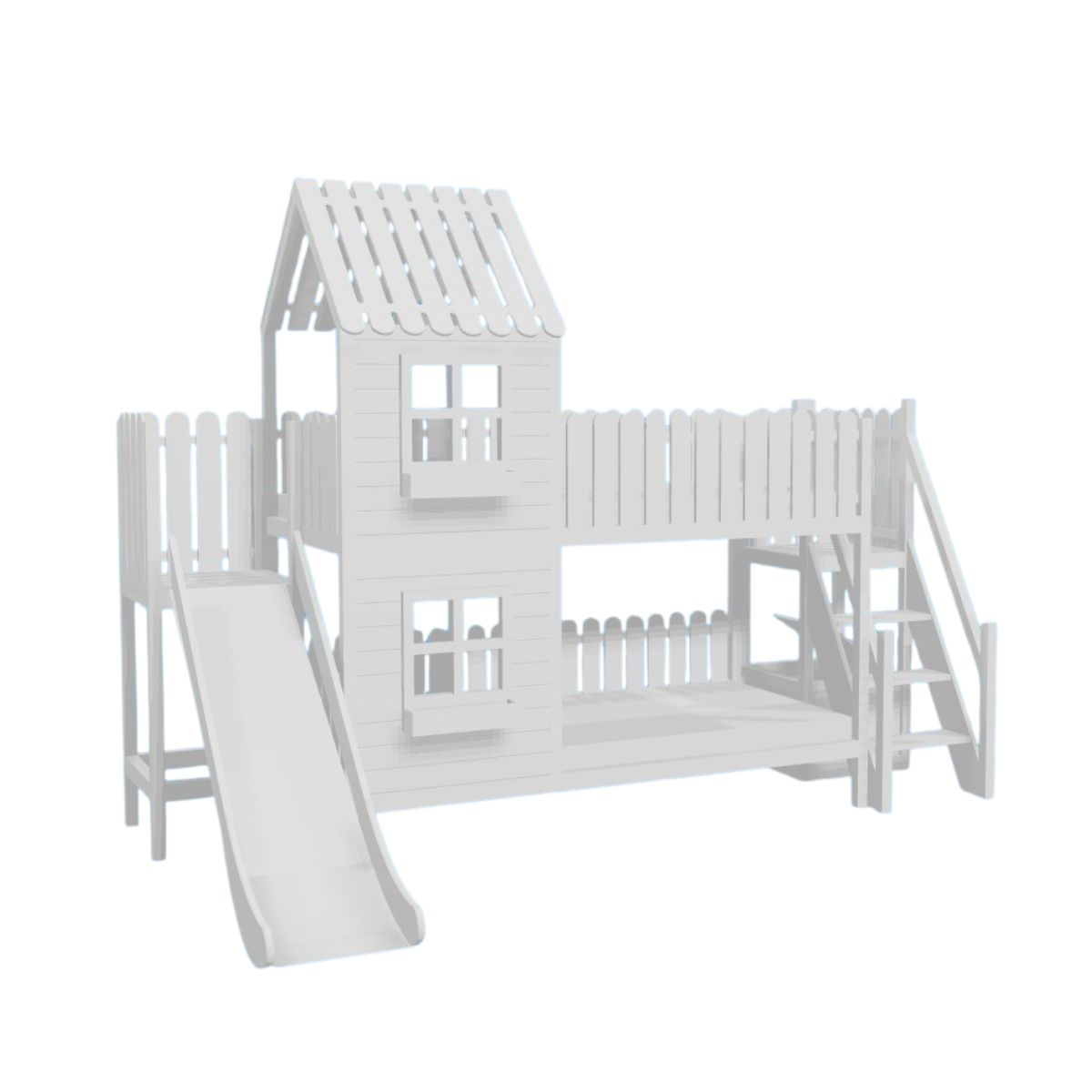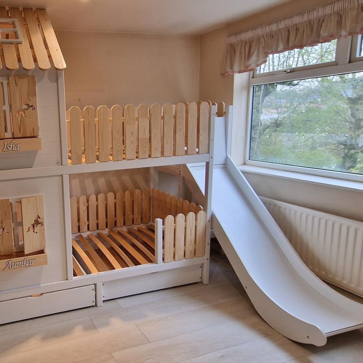 Łóżko piętrowe domek ze zjeżdżalnią i schodkami – Twoje domowe centrum przygody
