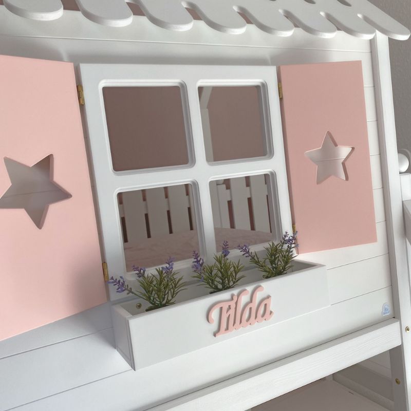 Łóżko piętrowe domek to baza, którą możesz dopasować do marzeń swoich dzieci. Ozdobny dach, urocze okiennice i doniczki nadają konstrukcji bajkowego wyglądu. Możesz spersonalizować łóżko dla rodzeństwa, tworząc mebel idealnie skrojony pod aranżację wnętrza.
