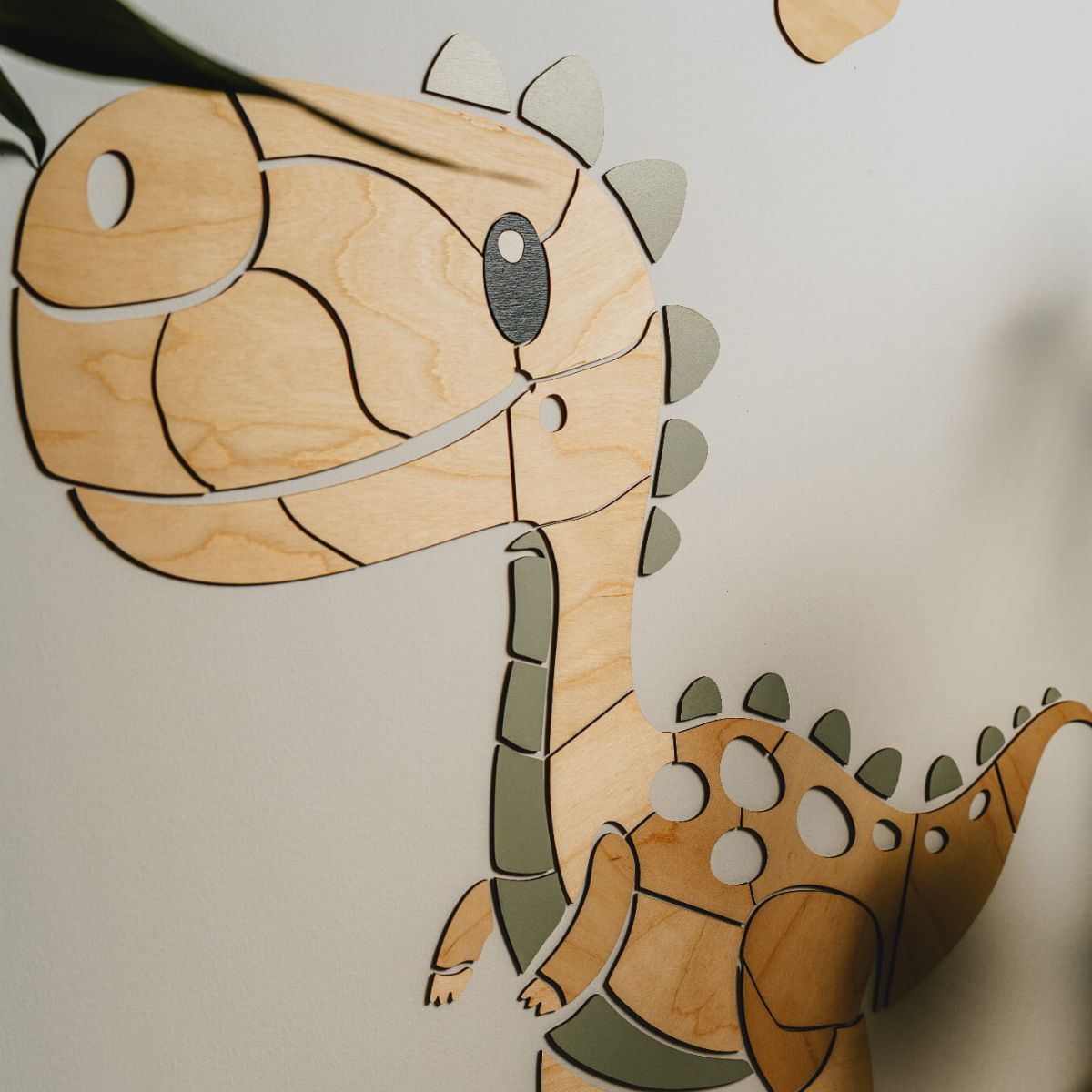 Dinozaur zachowuje naturalne barwy drewna, wzbogacone delikatnymi, oliwkowymi akcentami, co podkreśla jego autentyczność i rękodzielniczy charakter. Dzięki prostemu systemowi montażu – z użyciem taśmy dwustronnej, masy montażowej lub kleju – dekorację można łatwo i trwale umieścić na ścianie.