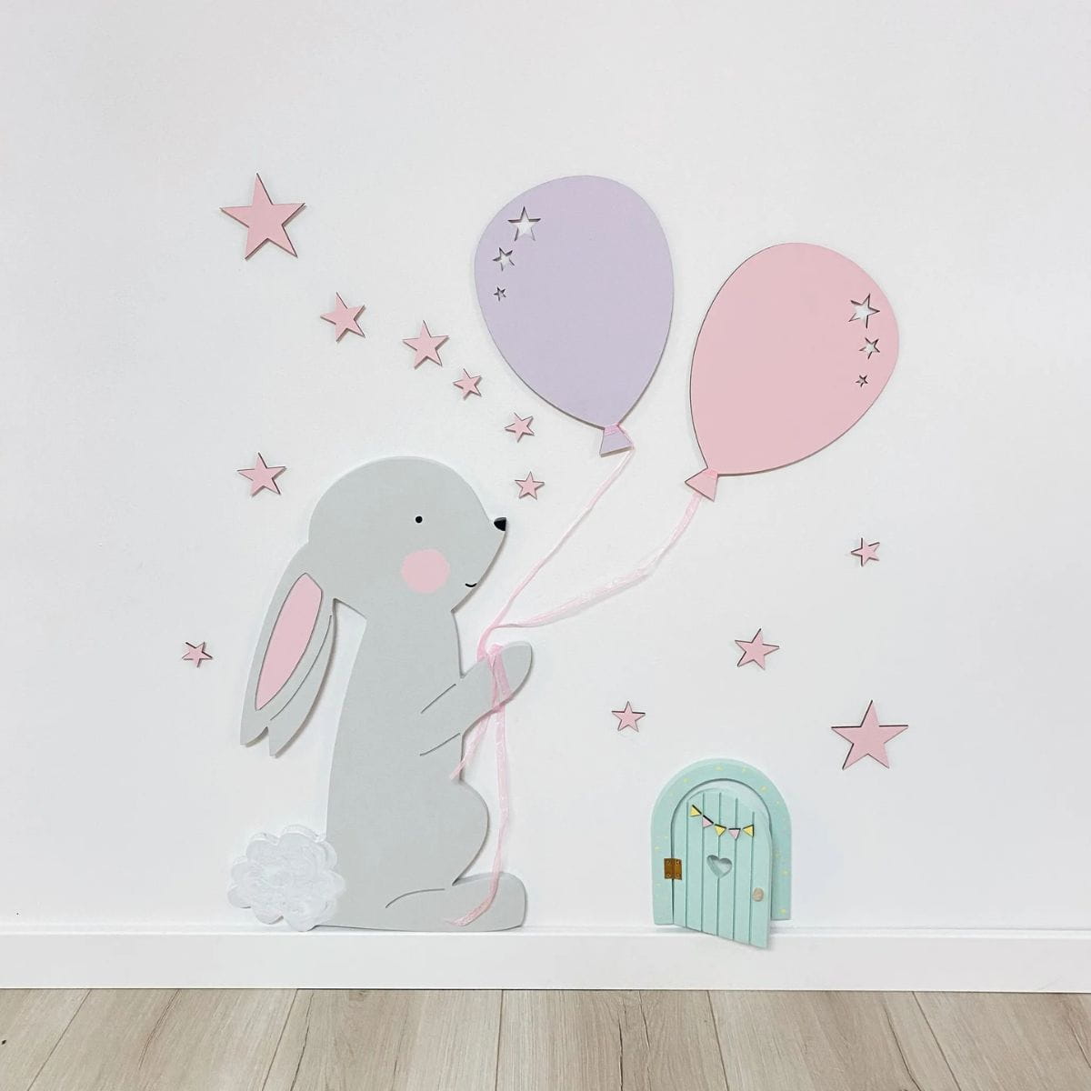 Do króliczka możesz dokupić zestaw dwóch balonów, które razem z króliczkiem stworzą spójną aranżację. Dzięki nim dekoracja nabierze jeszcze większej lekkości i bajkowego charakteru, tworząc ciepłą i przytulną atmosferę w dziecięcym pokoju. Wybrane kolory balonów wpisz w komentarzu do zamówienia.