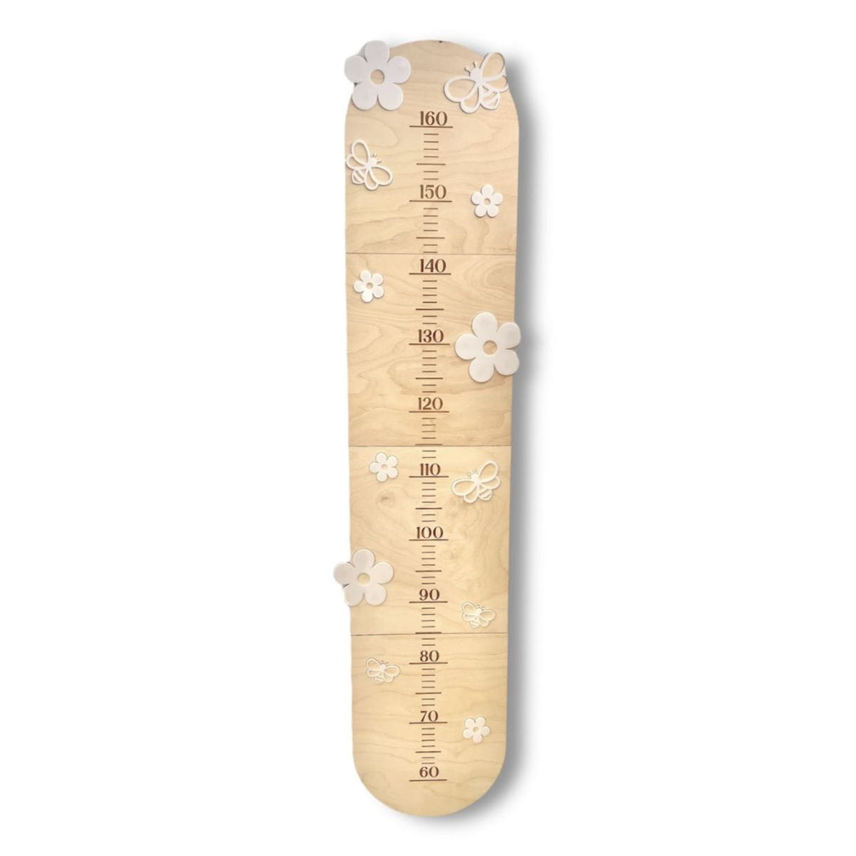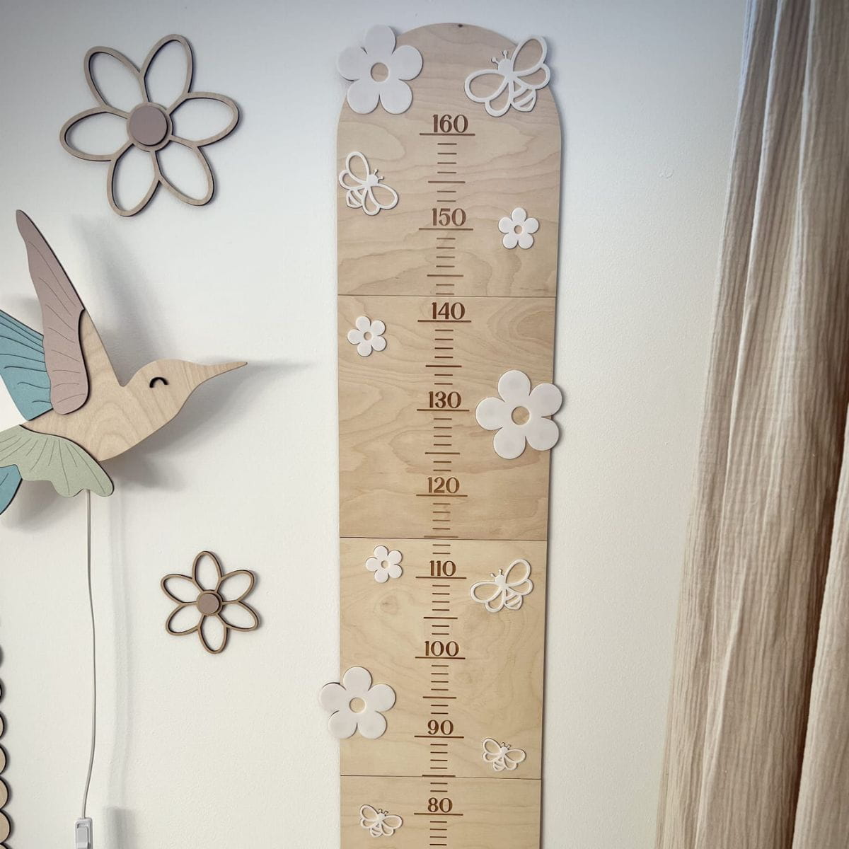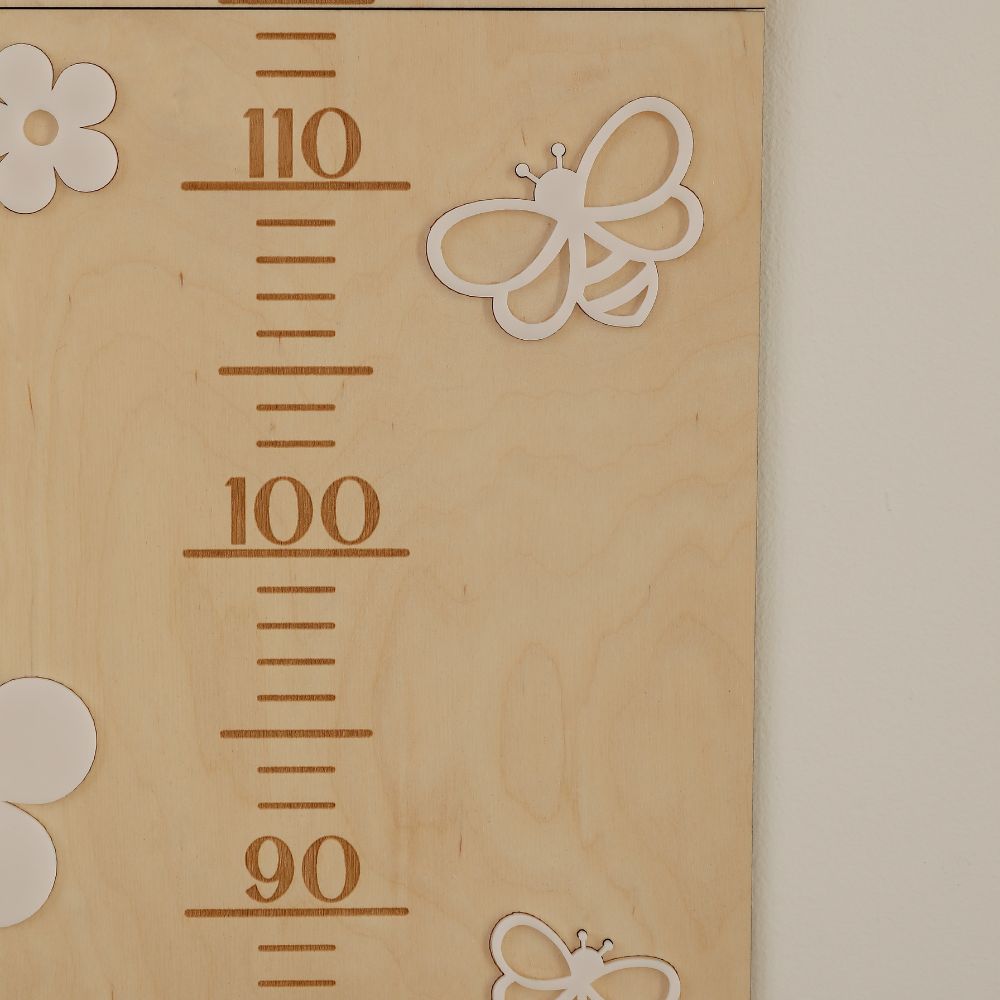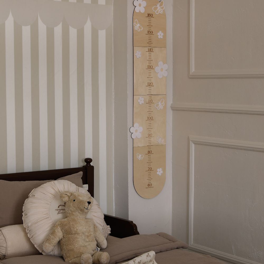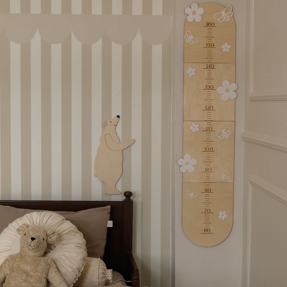 Miarka wzrostu Stokrotki zachwyca delikatnym wzornictwem, które doskonale komponuje się z wnętrzami inspirowanymi naturą. Wykonana z wysokiej jakości sklejki drewnianej, ozdobiona subtelnymi stokrotkami z pleksi oraz uroczymi pszczółkami, nadaje przestrzeni bajkowego uroku. Naturalne drewno w połączeniu z bielą kwiatków tworzy harmonijną i estetyczną całość, pasującą do każdego dziecięcego pokoju. Idealnie współgra także z drewnianymi ramkami i innymi dekoracjami w stylu boho czy skandynawskim.