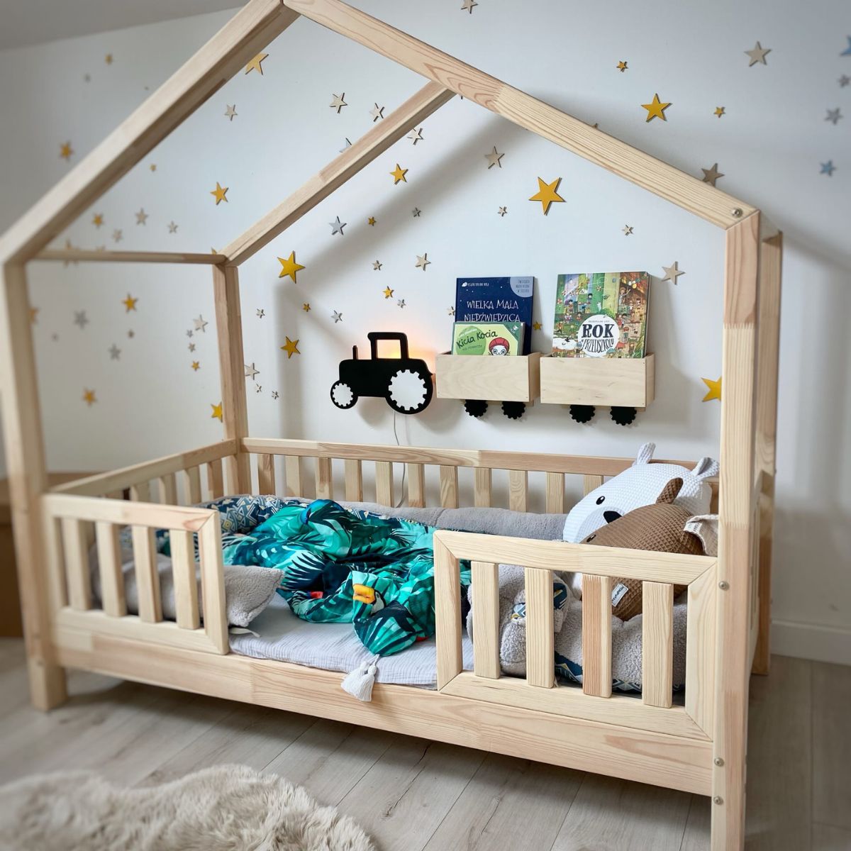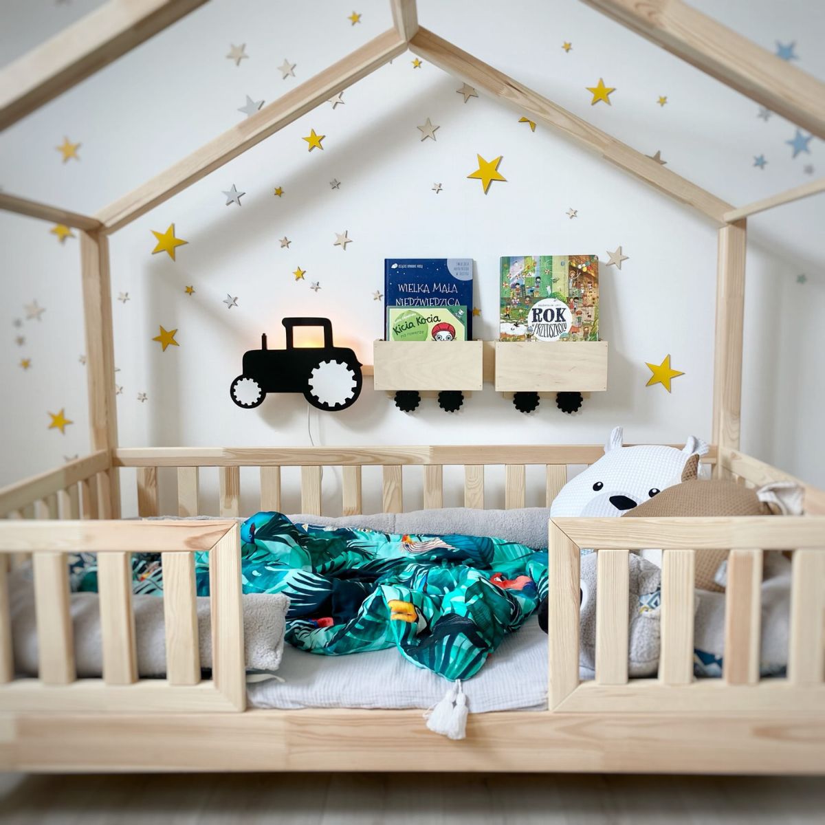 Ta wyjątkowa półka w kształcie traktora z przyczepami pełni podwójną rolę – rozświetla pokój przyjemnym, ciepłym światłem oraz oferuje przestrzeń na książki, ulubione zabawki i drobiazgi. Idealnie sprawdzi się jako nocna lampka, pomagając dziecku zasypiać w przyjaznej, bajkowej atmosferze.