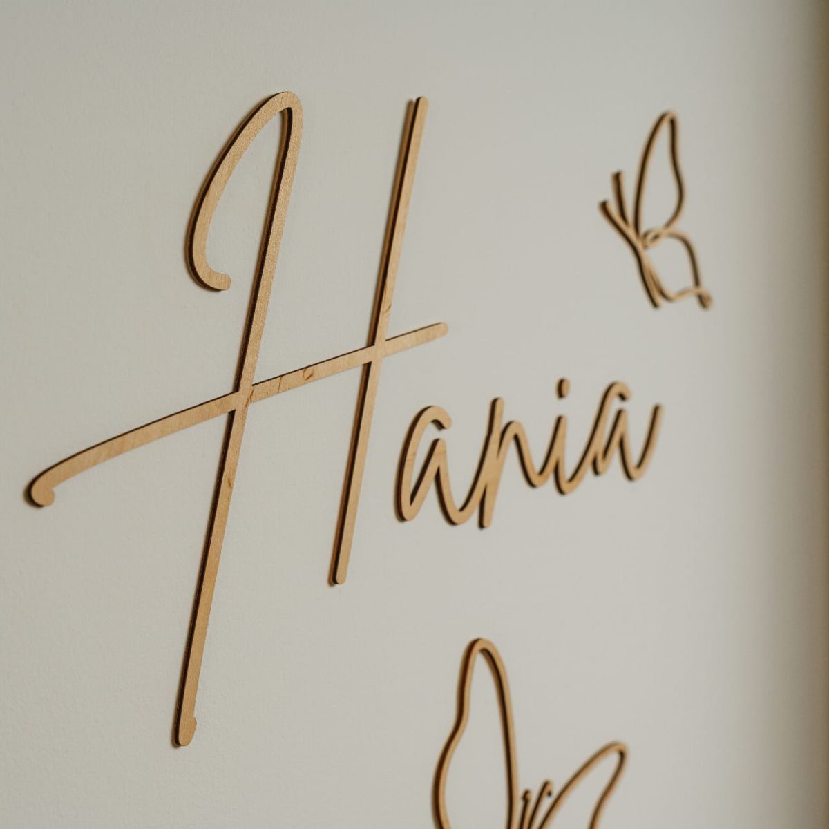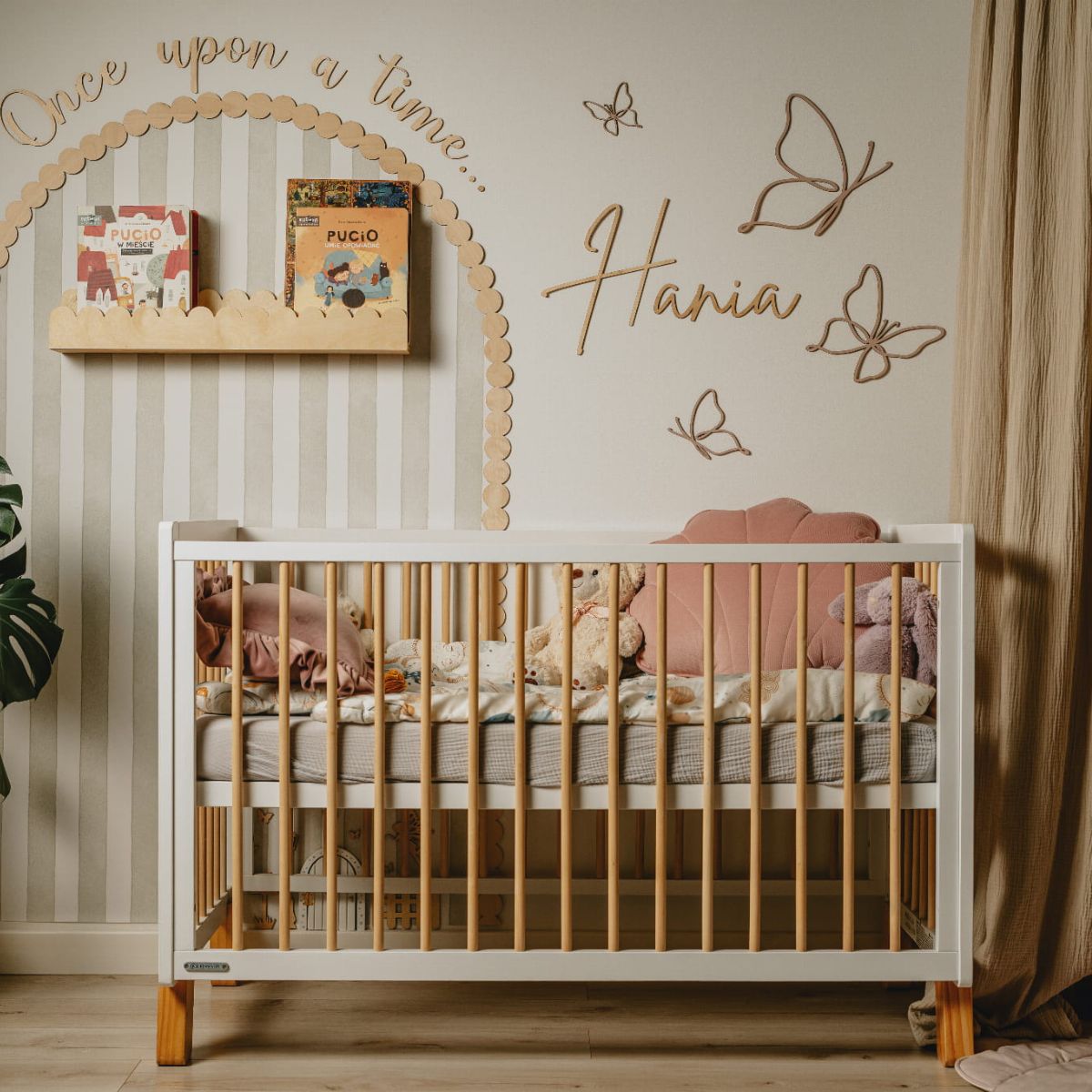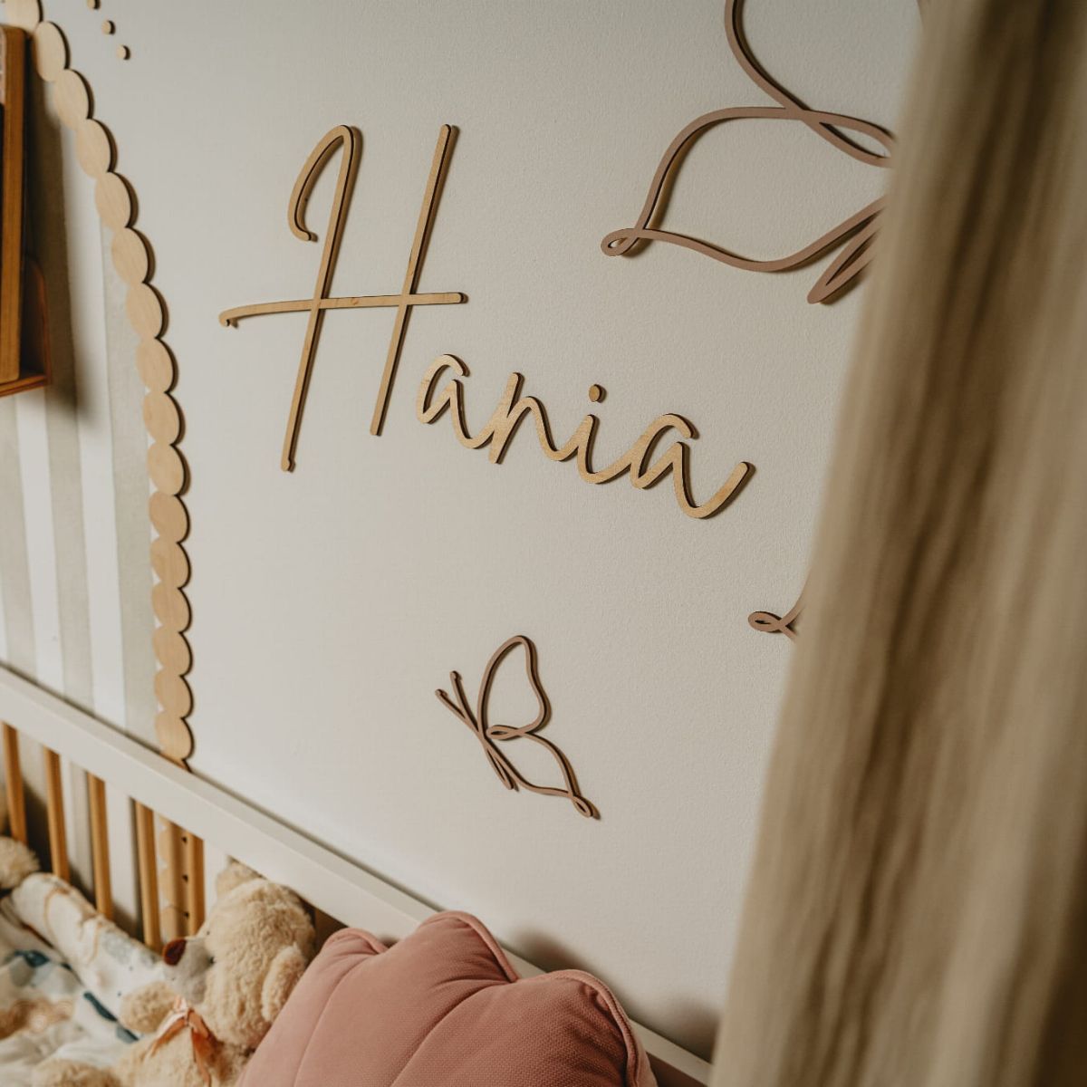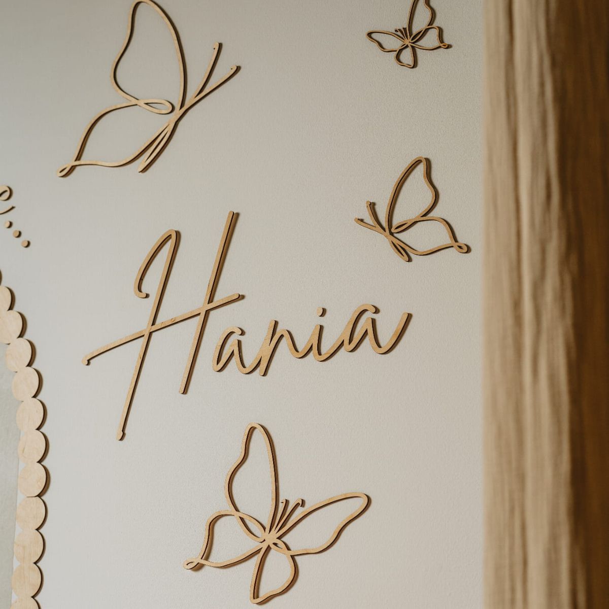 Są dekoracje, które tylko ładnie wyglądają. I są takie, które budują wspomnienia, nadają wnętrzu osobisty charakter i sprawiają, że pokój dziecka staje się jego prawdziwym, bajkowym światem. Zestaw „Imię + Motylki” to właśnie ten drugi rodzaj – ręcznie wykonany z miłością do detalu, z naturalnej sklejki, gotowy by stać się częścią codziennych rytuałów, snów i dziecięcej wyobraźni.