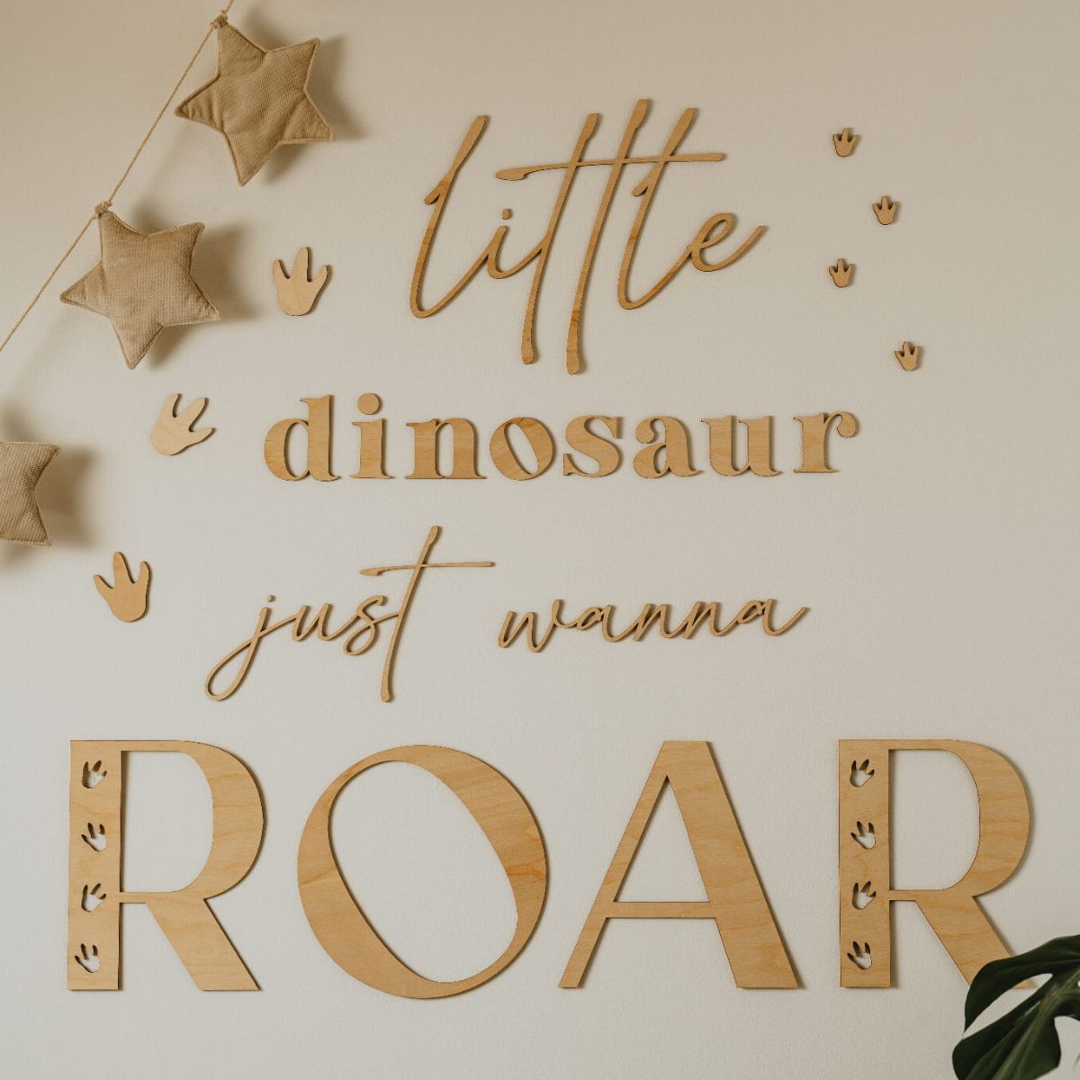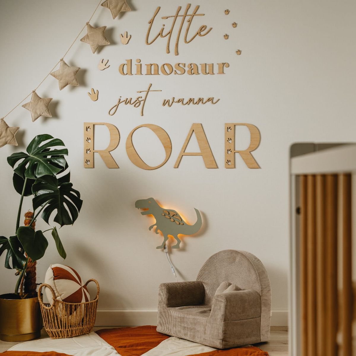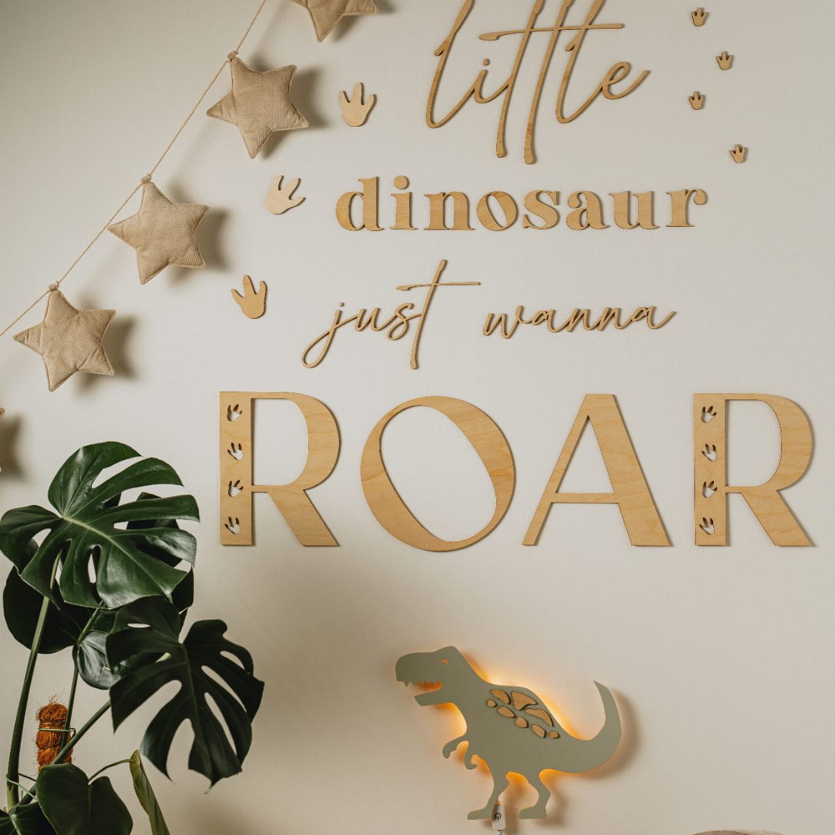 Niektóre dzieci marzą o dinozaurach, a inne… już nimi są! Drewniany napis "Little dinosaur just wanna ROAR" to nie tylko zabawna i piękna dekoracja ścienna, ale też inspiracja do stworzenia całego kącika w klimacie przygody i prehistorycznych emocji.