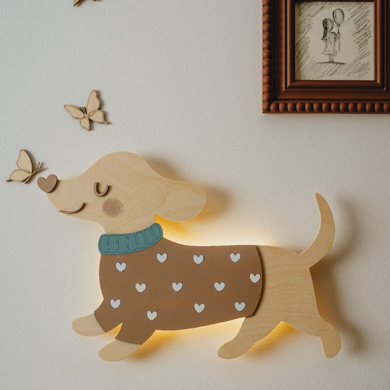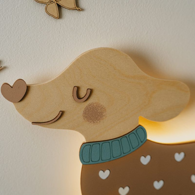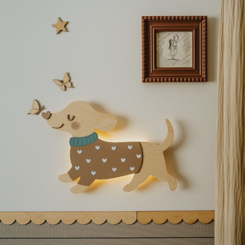 Przyjazna, spokojna forma jamnika sprawia, że lampka doskonale wpisuje się w dziecięcą przestrzeń. Może pełnić funkcję dekoracji ściennej, ale też stać się „oswojonym” elementem codzienności – obecnym przy zasypianiu, czytaniu i wieczornych rozmowach.