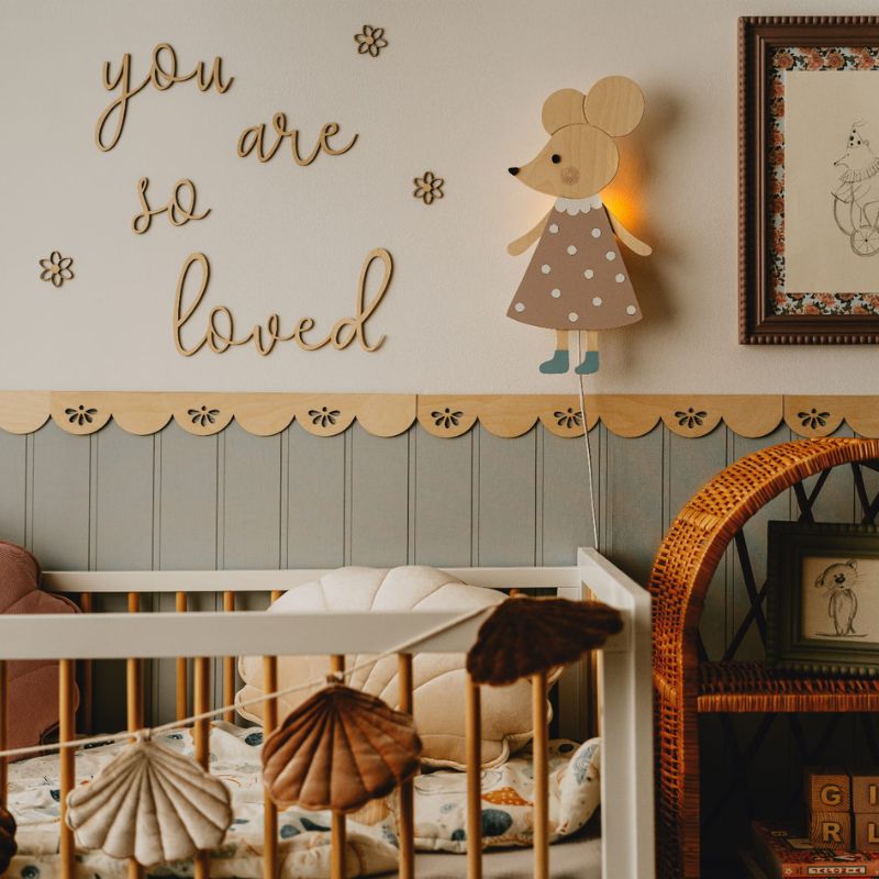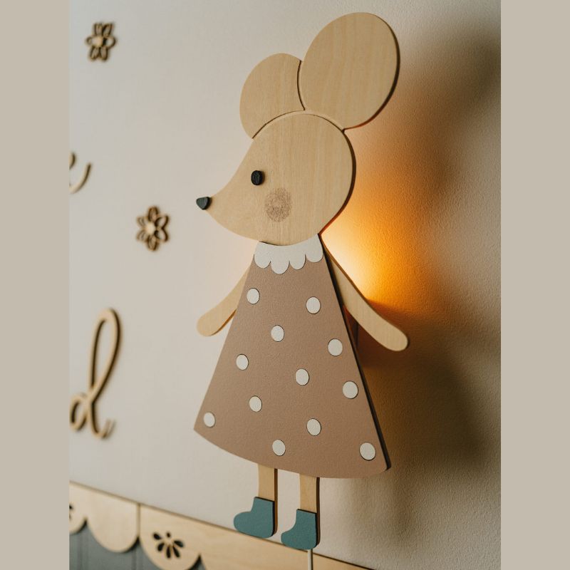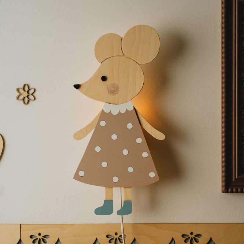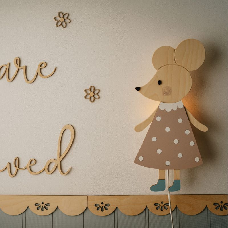 Lampka nocna Myszka z drewna – subtelne światło i elegancka dekoracja do pokoju dziecka