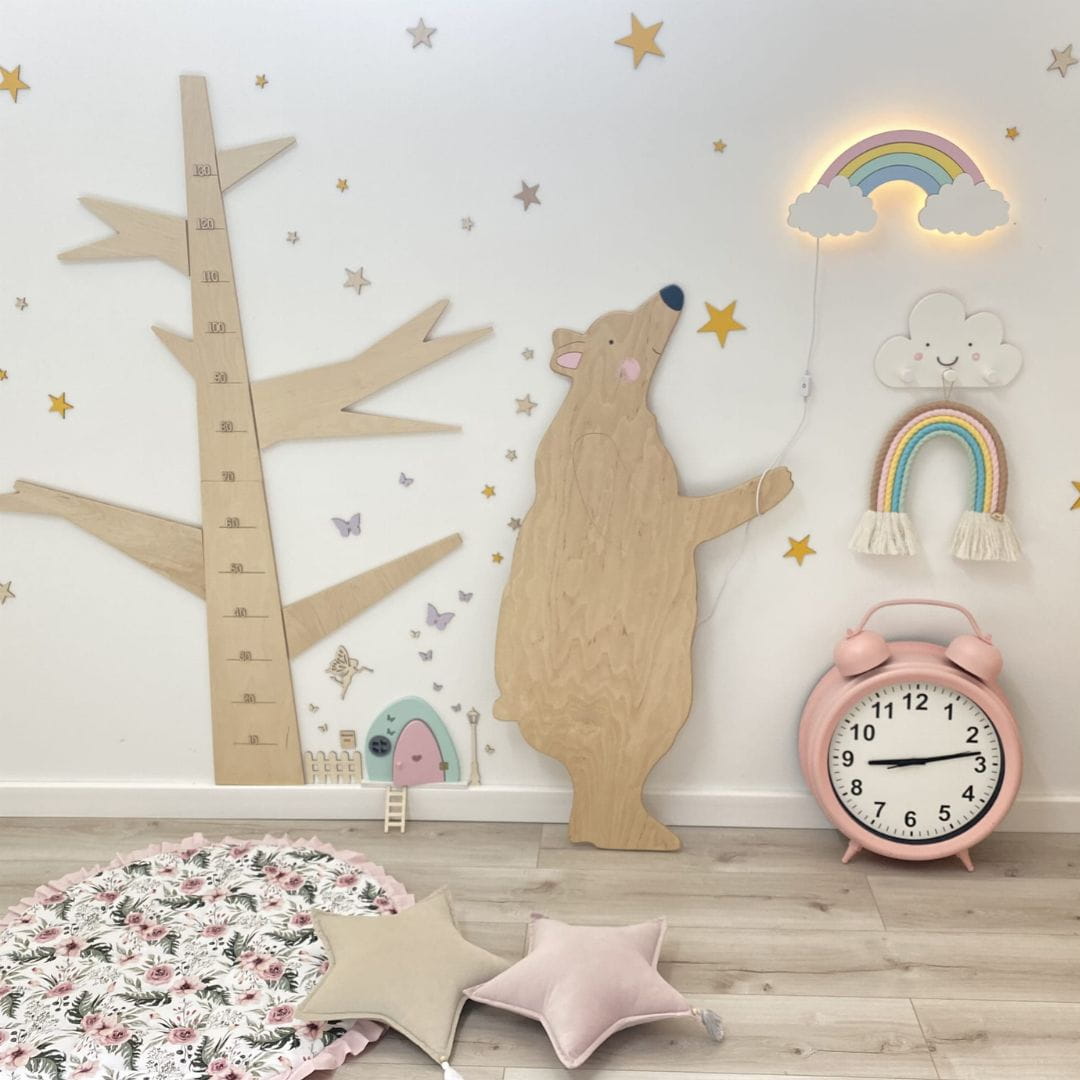 - Ekologiczne materiały – Wykonana z wysokiej jakości sklejki drewna liściastego. Lampka jest malowana ekologicznymi farbami, bez ostrych zapachów i szkodliwych substancji, co sprawia, że jest idealna do użytku w pokojach dziecięcych.