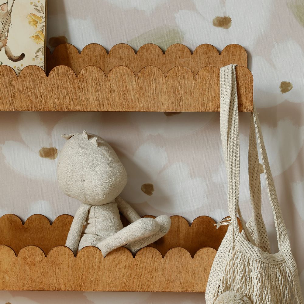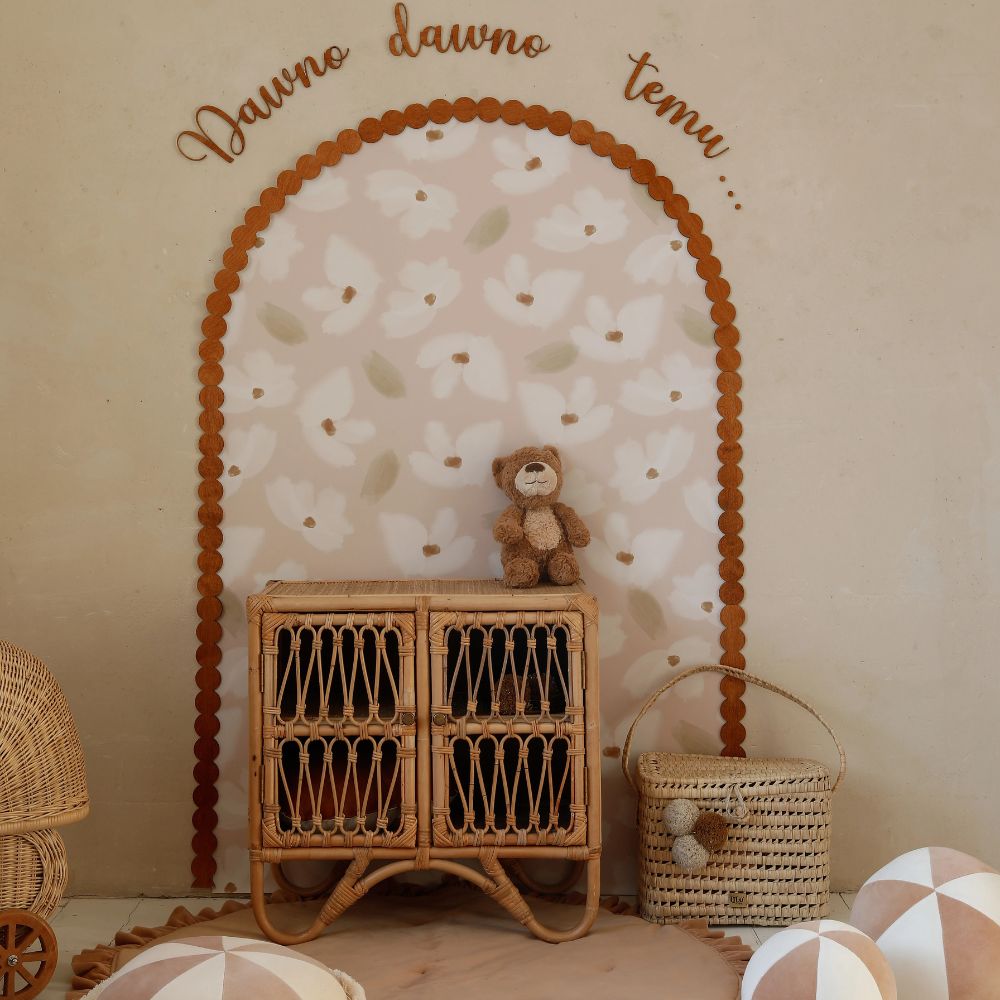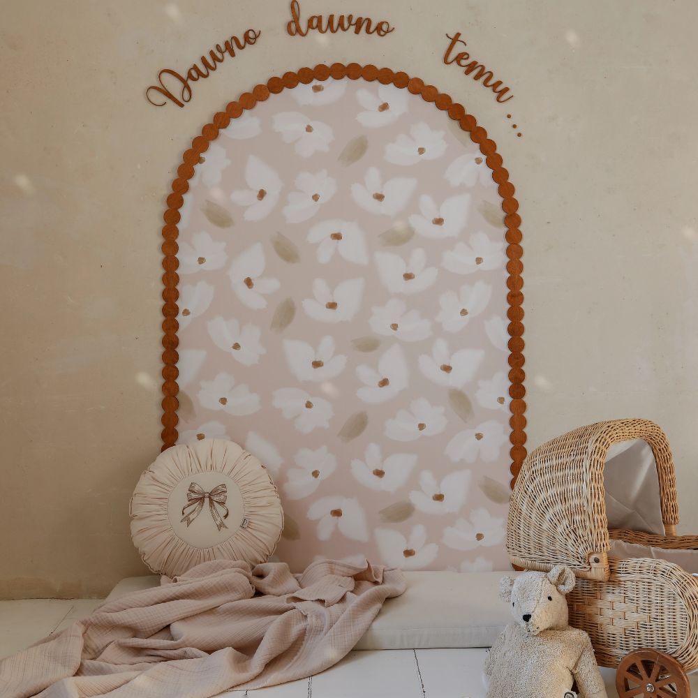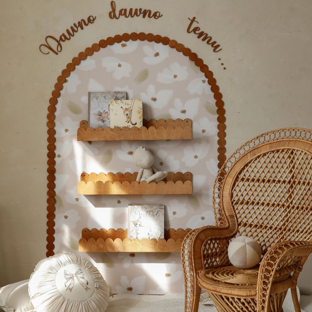 - Pełna bajkowa aranżacja: naklejka (kwiaty na bladoróżowym tle) + drewniana ramka + napis "Dawno, dawno temu..." + 3 półki Falbanka