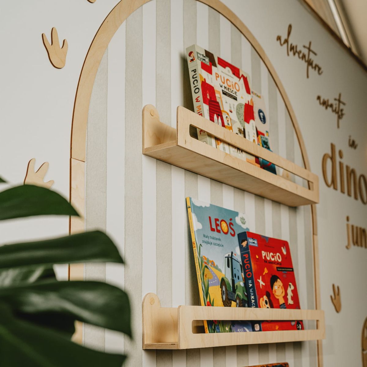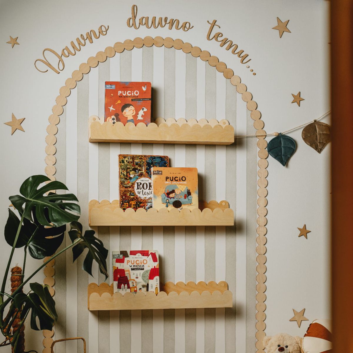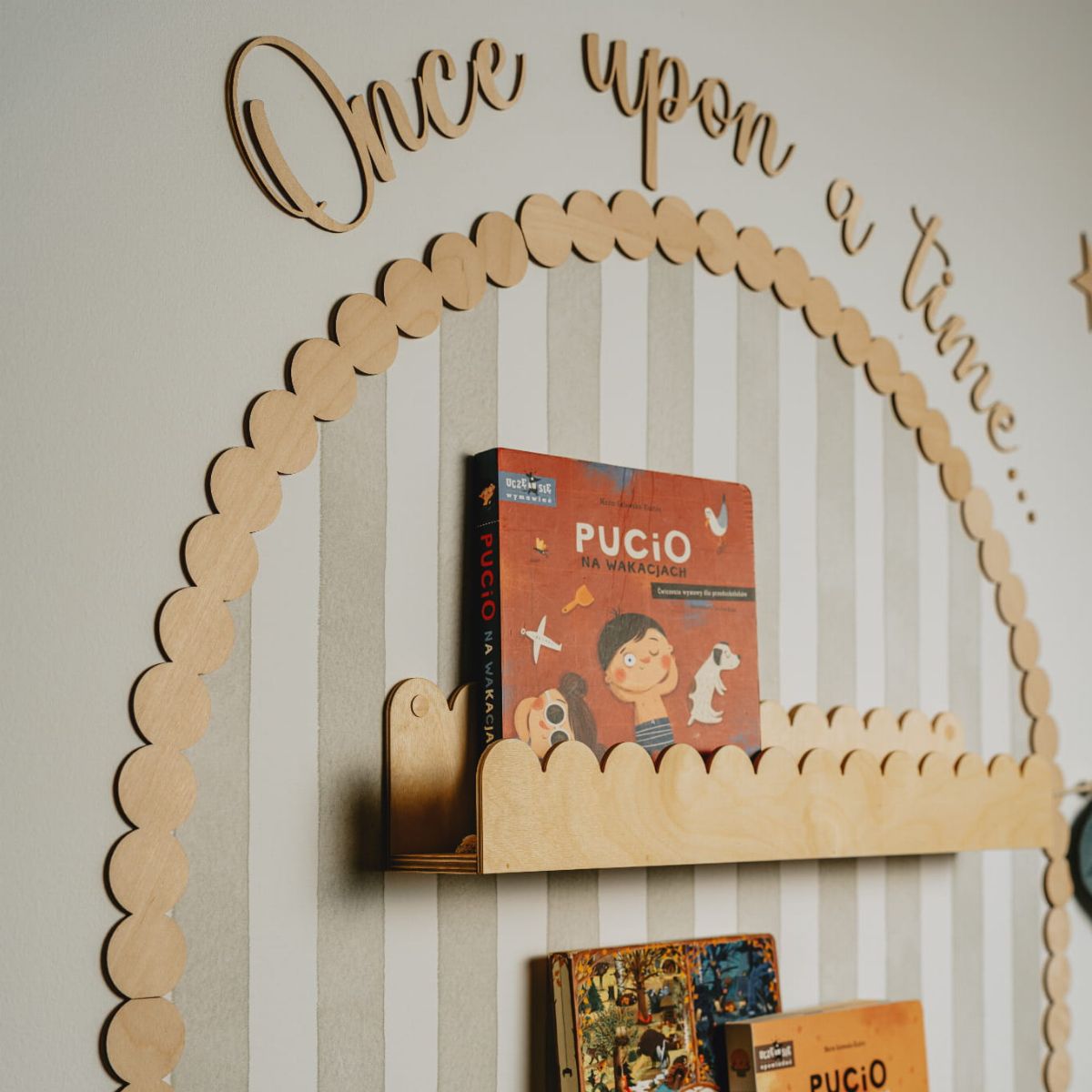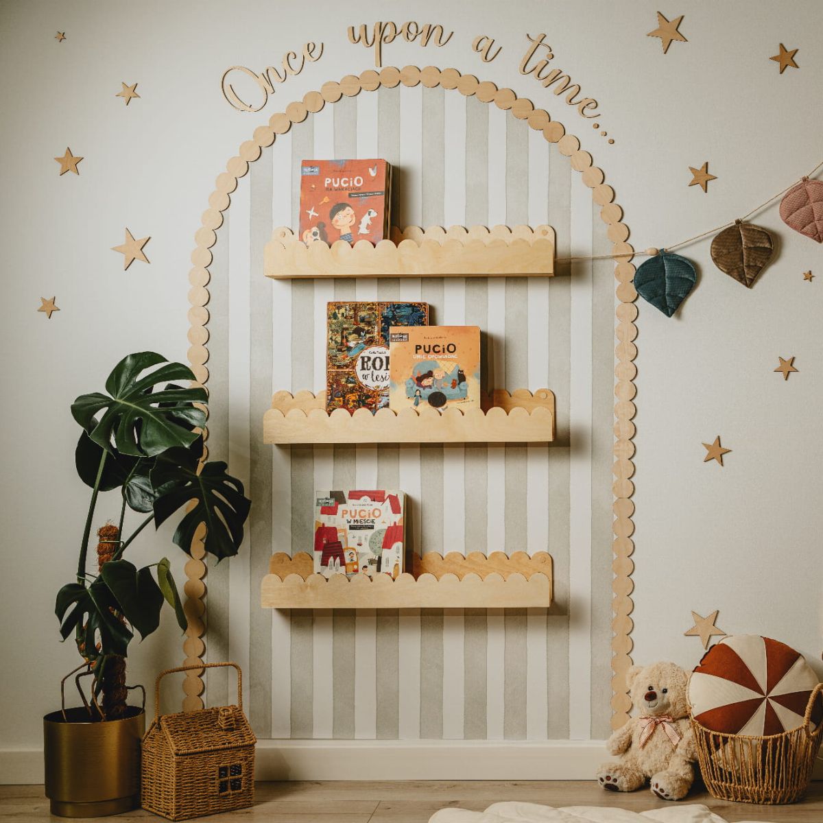 - Pełna bajkowa aranżacja: naklejka (łuk w oliwkowe paski) + drewniana ramka (prosta lub kuleczkowa) + napis "Dawno, dawno temu..." lub "Once upon a time" + 3 półki ONE lub 3 półki falbanka