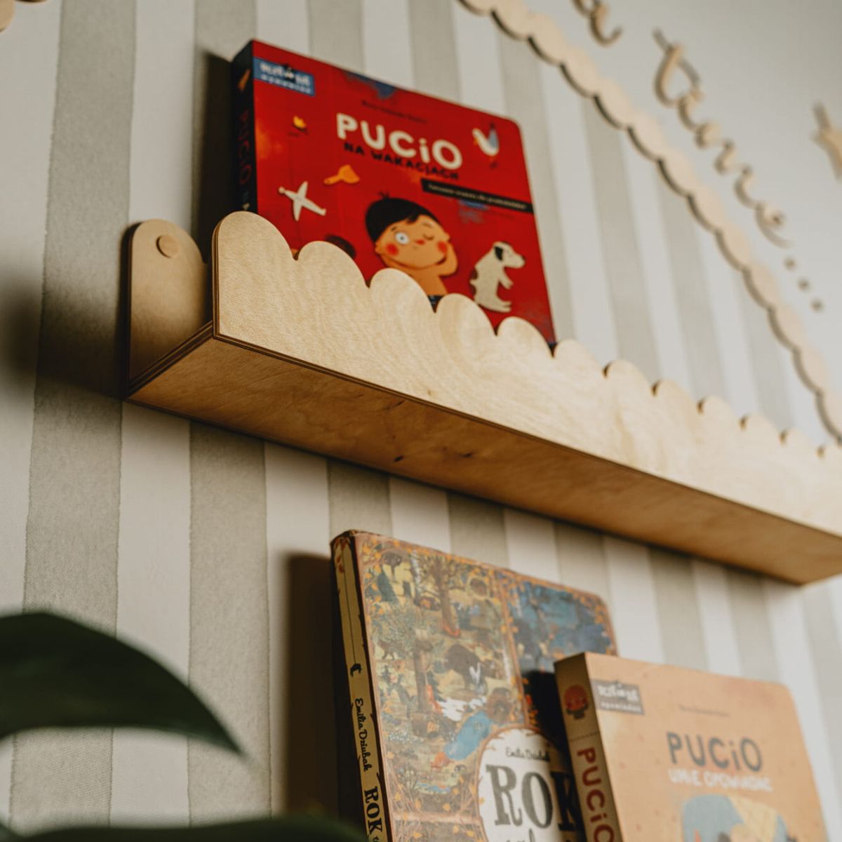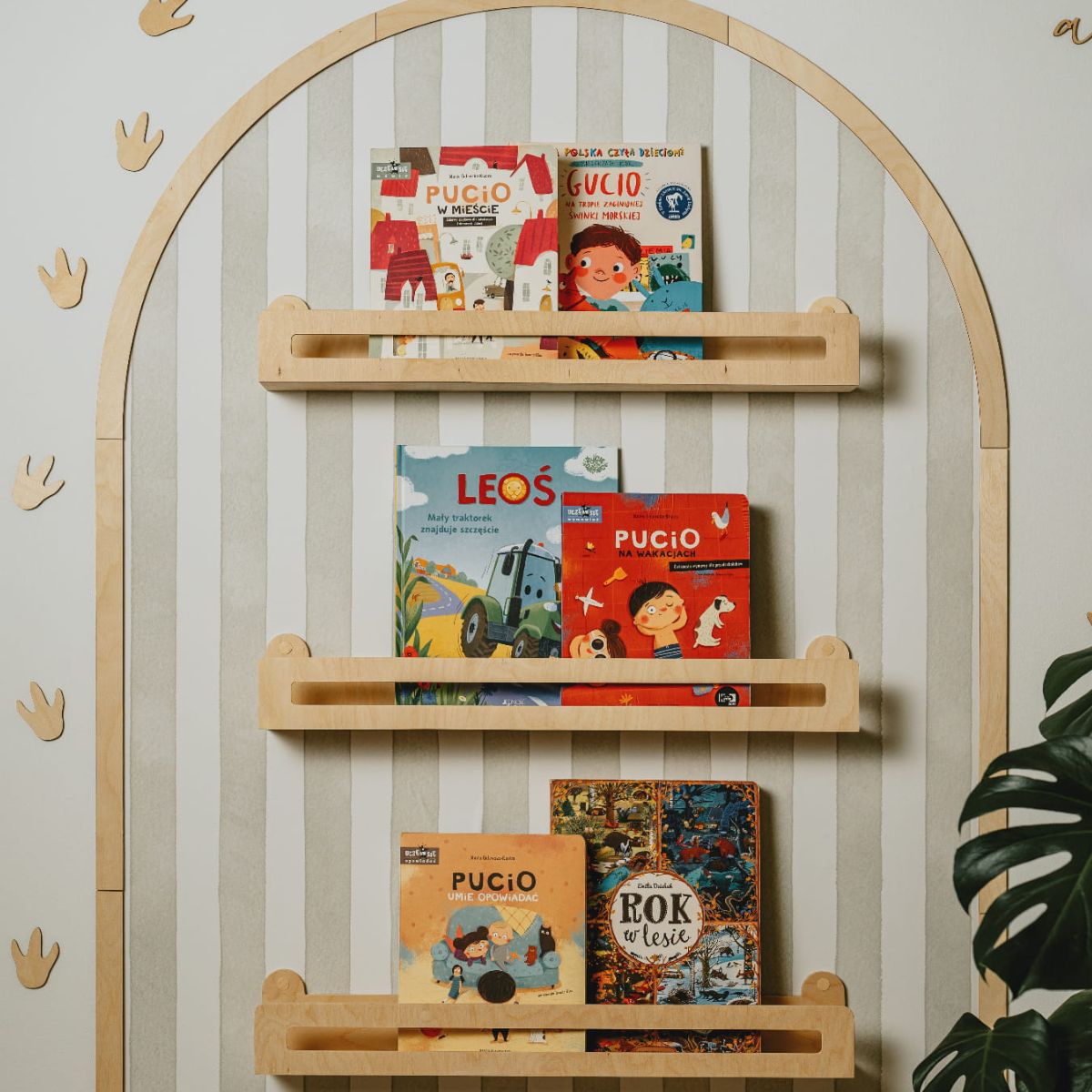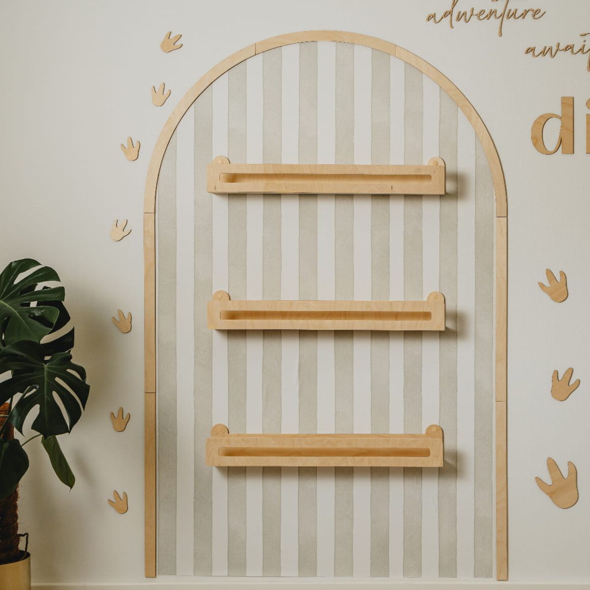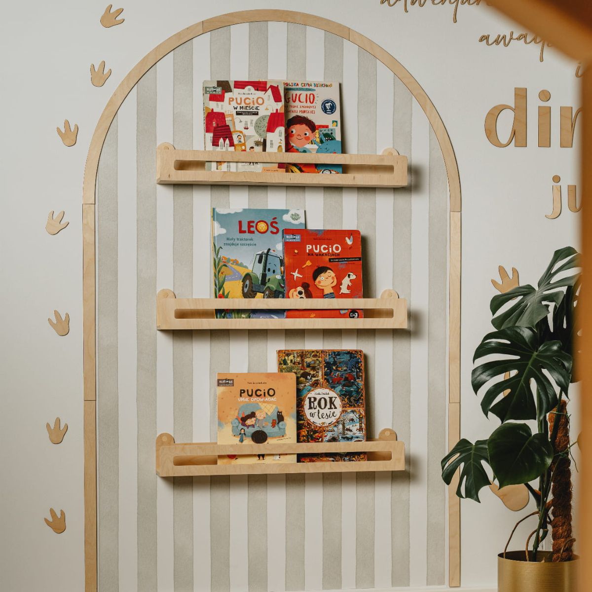 - Pełna bajkowa aranżacja: naklejka (łuk w oliwkowe paski) + drewniana ramka (prosta lub kuleczkowa) + napis "Dawno, dawno temu..." lub "Once upon a time" + 3 półki ONE lub 3 półki falbanka