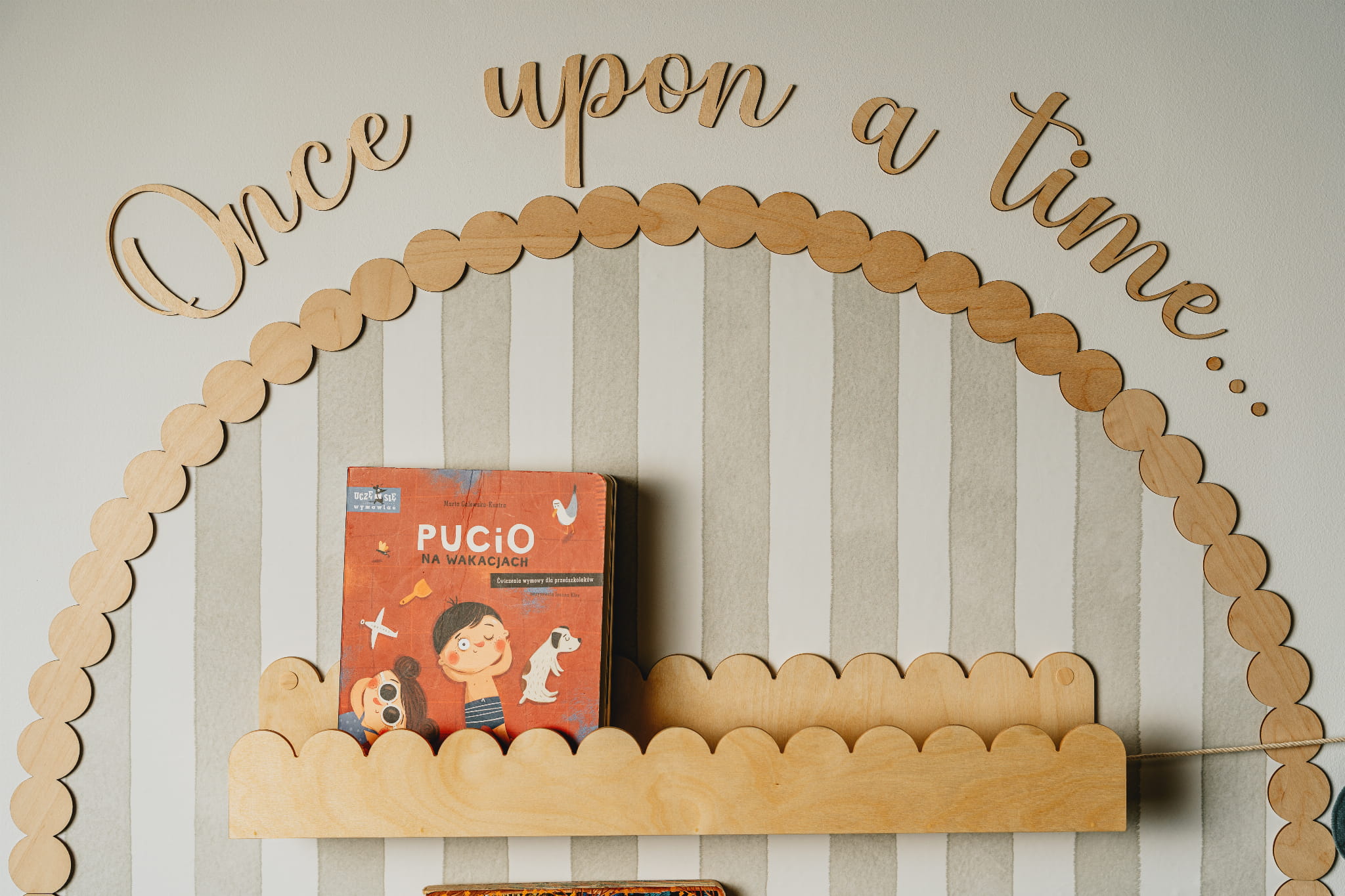 - Stylowa dekoracja z funkcją przechowywania: drewniana ramka (prosta lub kuleczkowa) + napis "Dawno, dawno temu..." lub "Once upon a time" + 3 półki ONE lub 3 półki falbanka
