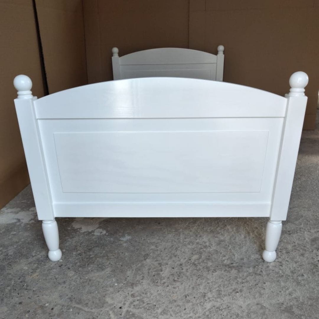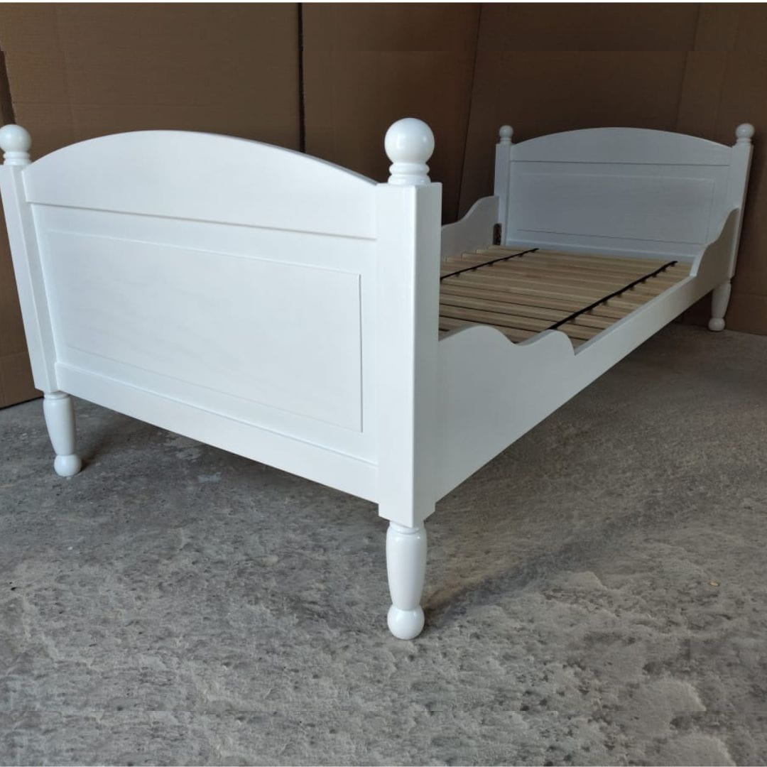 Łóżko do pokoju dziecka ze zdobionymi nogami oraz klasycznym wykończeniem drewnianymi kulkami to idealne rozwiązanie dla rodziców ceniących klasyczny, ponadczasowy design. Łóżko w kolorze białym będzie pasowało do większości dziecięcych wnętrz i aranżacji. Łóżko jest bezpieczne dla dzieci, ekologiczne, wyprodukowane w Polsce, w 100% z naturalnych materiałów. Łóżeczko wykonane jest z drewna sosnowego. Boki łóżka zaprojektowane z myślą o ochronie dziecka przed spadnięciem - nie ma konieczności kupowania dodatkowej barierki ochronnej. Do dziecięcego łóżka w komplecie dołączony jest drewniany stelaż pod materac.