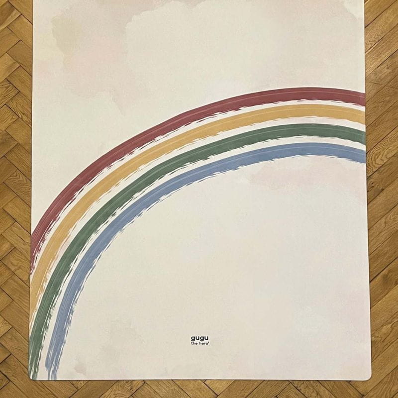 Mata dla dzieci Gugu the Hero wykonana jest z naturalnego, biodegradowalnego kauczuku oraz warstwy delikatnej mikrofibry. Mata doskonale trzyma się podłogi, amortyzuje, a raczkujące lub uczące się chodzić dziecko ma stabilne podłoże bez wysokich brzegów. Delikatna warstwa wierzchnia daje komfort przyjemnego dywanu.