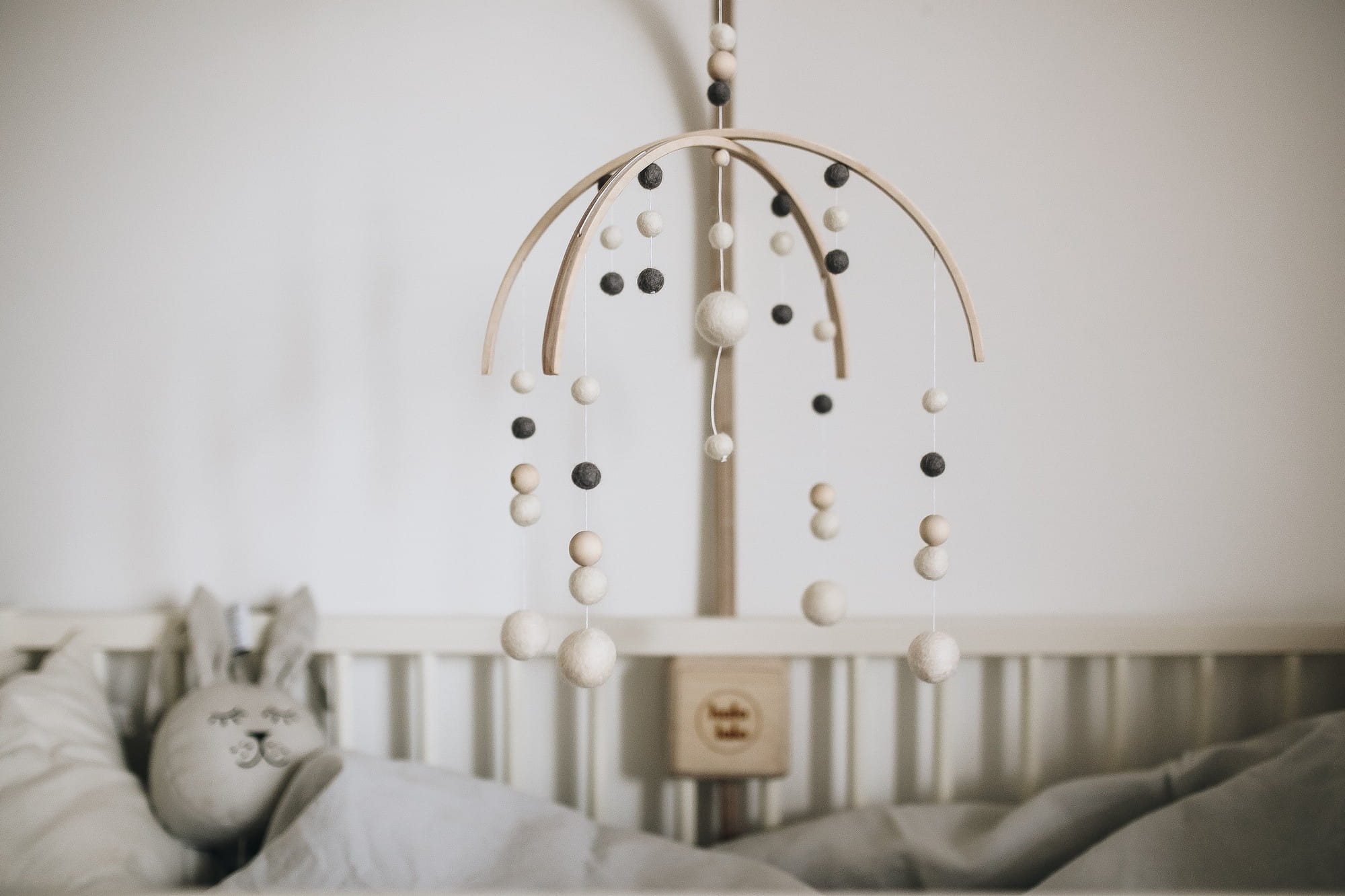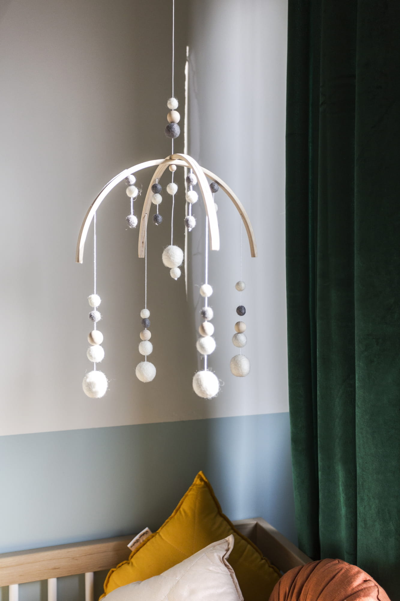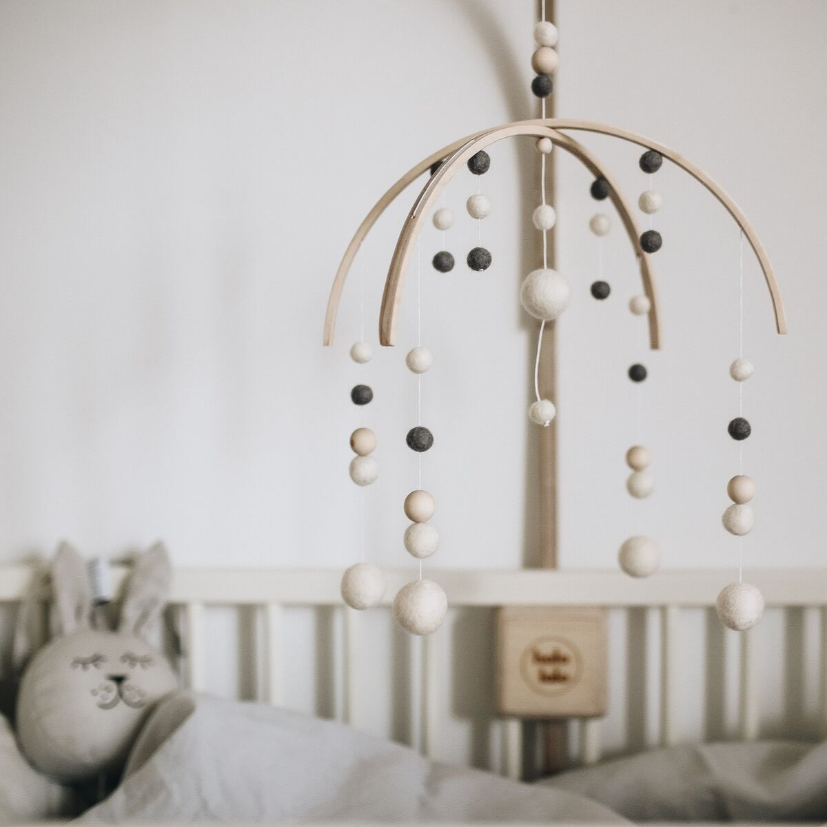 Starannie, ręcznie wykonany, oryginalny element wyprawki do łóżeczka. Karuzelka z filcowymi kuleczkami Halolalo będzie pięknym wykończeniem kącika maluszka.