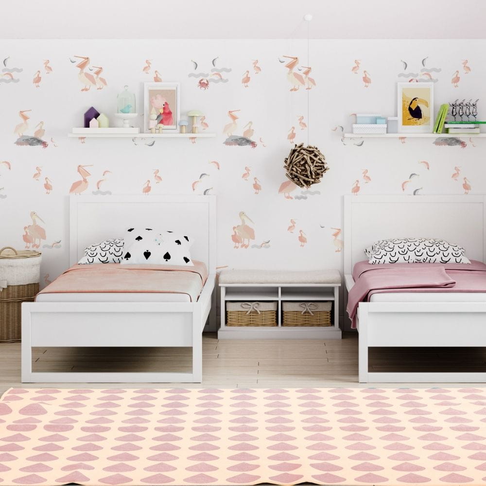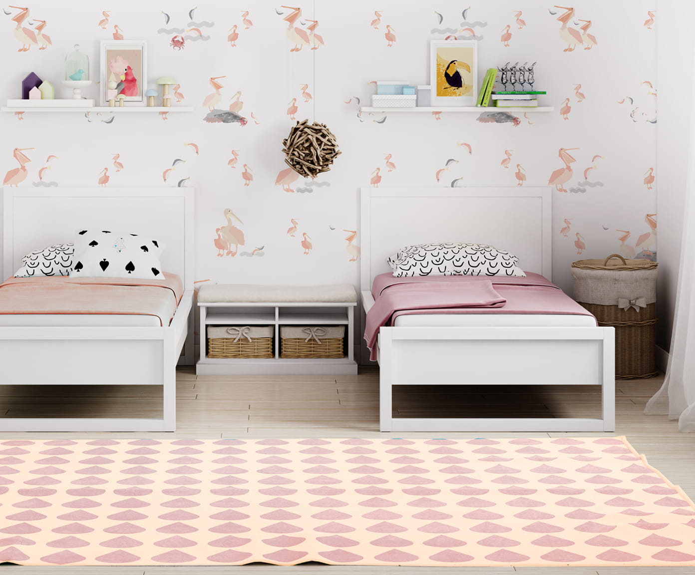 Tapeta dla dzieci w różowe pelikany. Jest rozwiązaniem do wielu pokoi dziecięcych. Świetnie komponuje się w minimalistycznych wnętrzach wśród białych mebli.