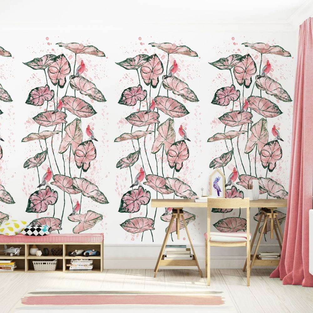 Tapeta dla młodzieży w różowe papugi i tropikalne liście. Stworzy cudowny klimat, nadając niezwykłej przytulności oraz wyjątkowego charakteru we wnętrzu. Świetnie komponuje się w minimalistycznych wnętrzach wśród białych mebli. Tapeta posiada białe tło.
