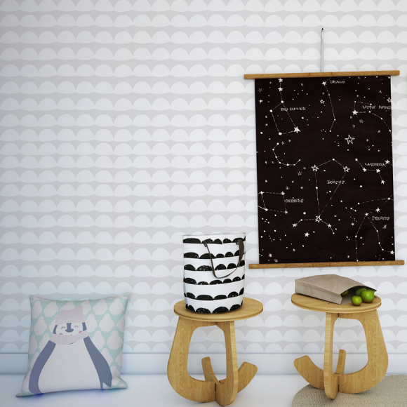 Tapeta dziecięca Scoops White stworzy niepowtarzalny klimat. Spodoba się miłośnikom skandynawskich wnętrz i oszczędnych form. Tapeta idealnie komponuje się w pokoju dziecięcym jak również pomieszczeniach dla dorosłych. Elementy wzoru to układ białych półkoli, umieszczonych na szarym tle.