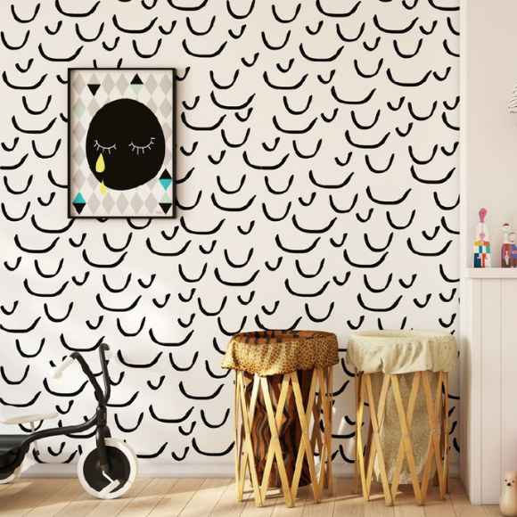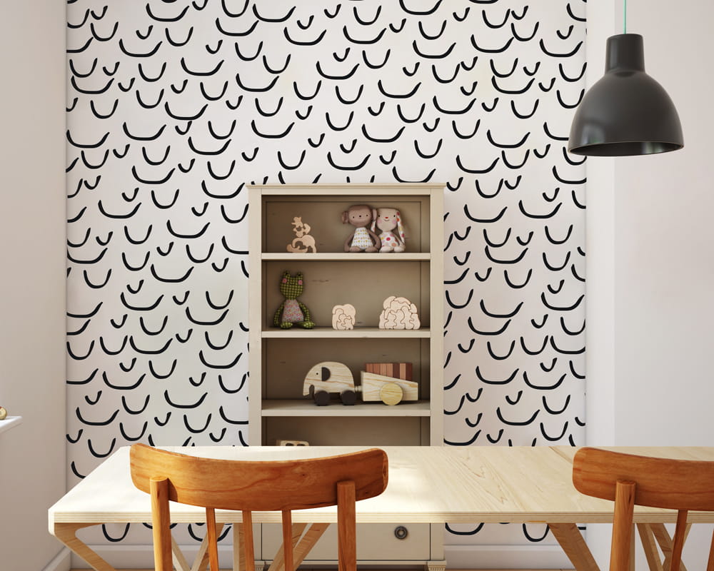 Tapeta dziecięca Smile z kolekcji Just Simple spodoba się miłośnikom skandynawskich wnętrz i oszczędnych form. Elementy wzoru zawierają linie w kształcie uśmiechu w kolorze czarnym. Nastraja pozytywnie od samego rana :)