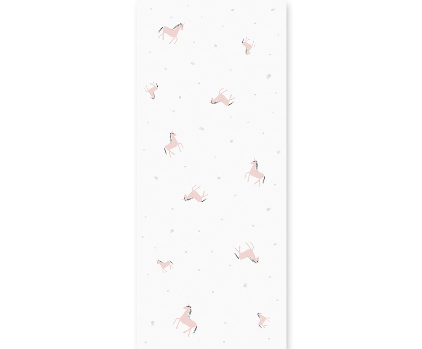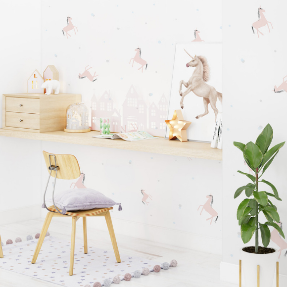 Tapeta dla dzieci Unicorn Dots to uwielbiany wzór konika przez najmłodszych. Elementami grafiki są tym razem różowe jednorożce i rozsypane kropki szaro błękitne. Całość staje się delikatna w odbiorze, nie zakłóca przestrzeni a wśród białych mebelków wygląda wspaniale.