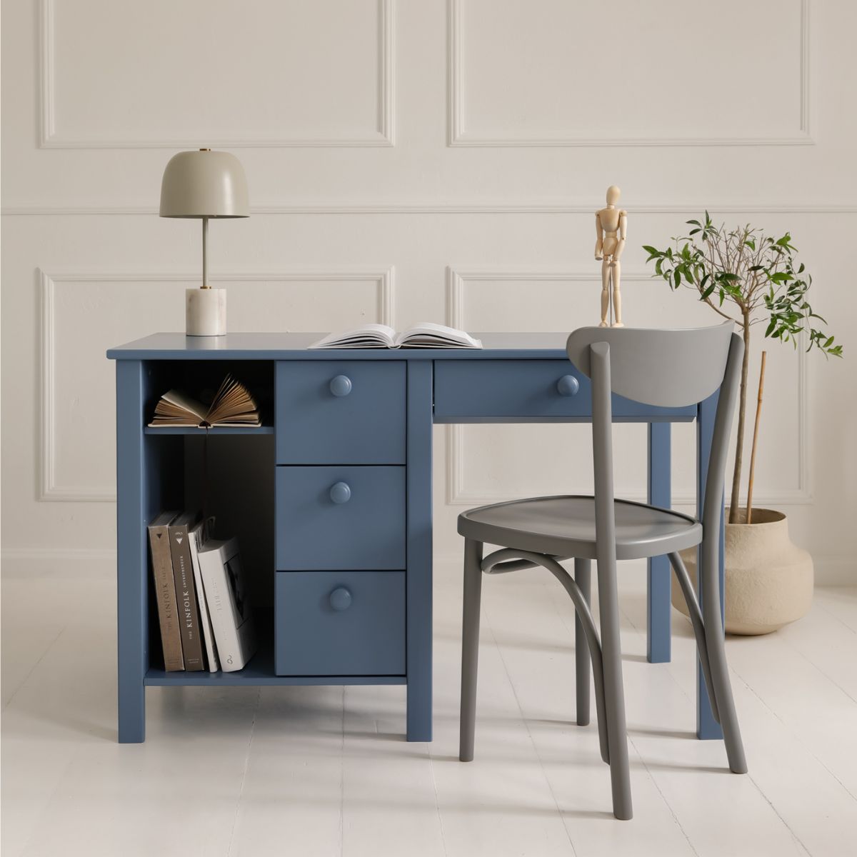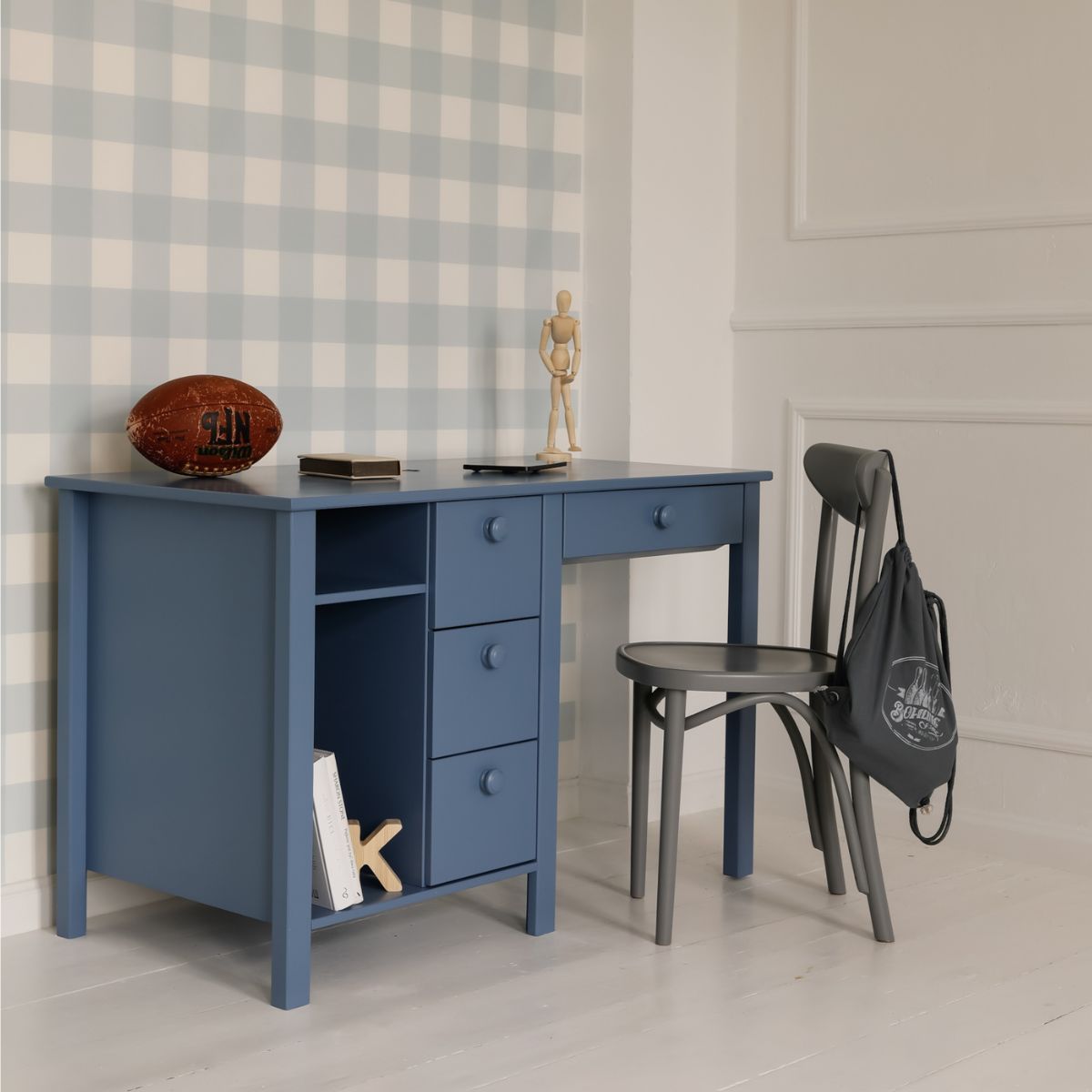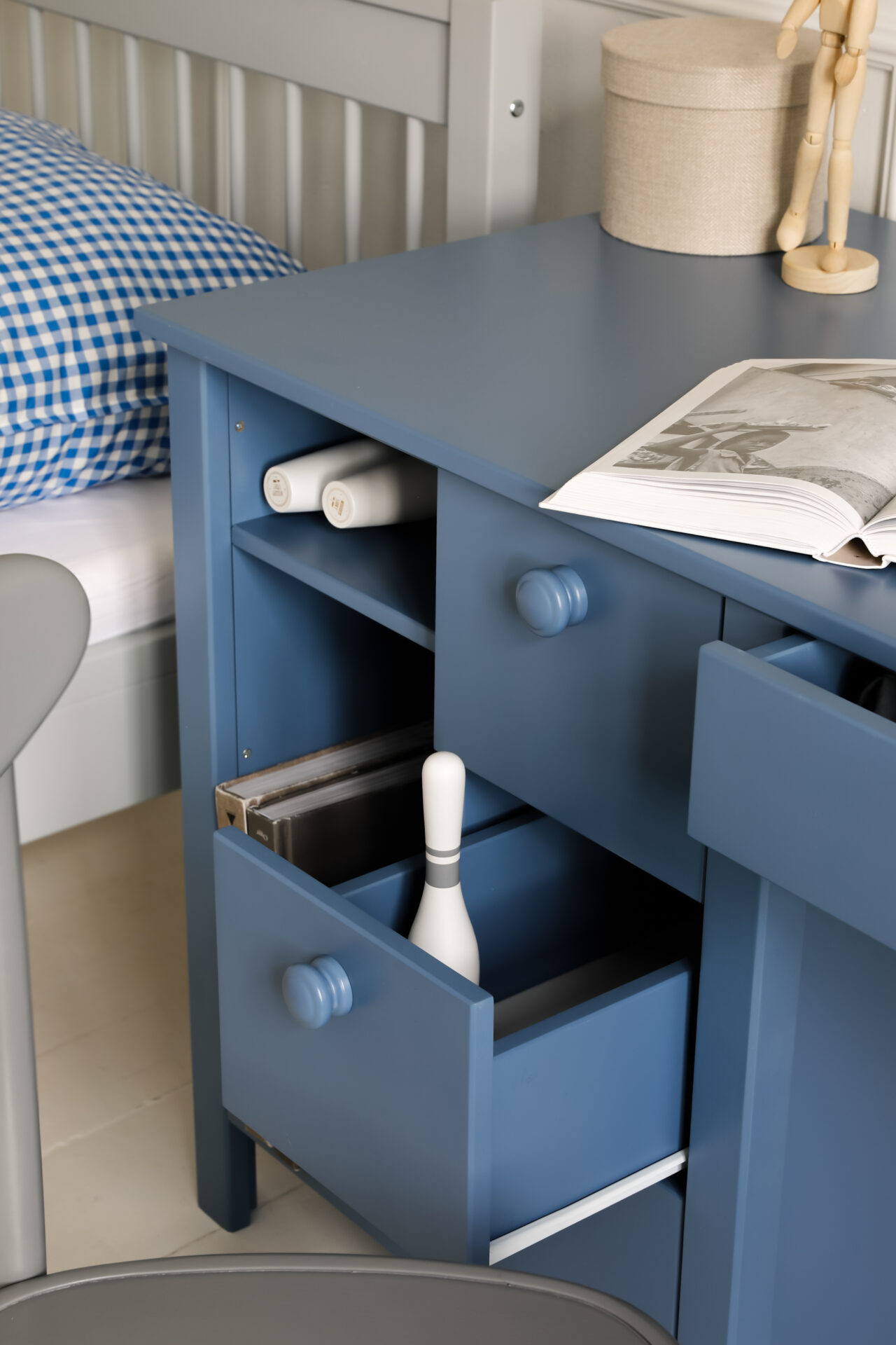 Biurko wykonano z naturalnego drewna sosnowego i wytrzymałej płyty MDF, pokrytej bezpiecznymi, wodnymi farbami z atestem, które są odpowiednie do kontaktu z dziećmi. Dzięki solidnej konstrukcji mebel posłuży przez wiele lat – od pierwszych rysunków po przygotowania do egzaminów.