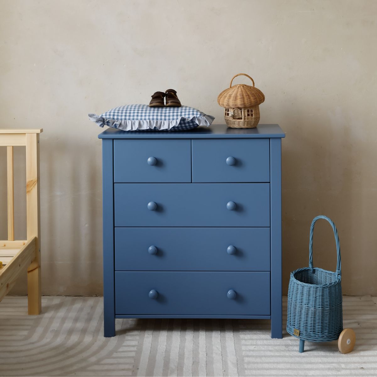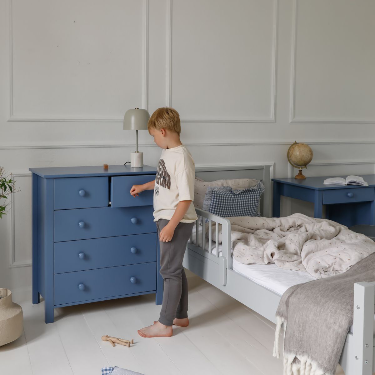 Komoda Collet wyróżnia się nowoczesnym, ciemnoniebieskim kolorem, który wprowadza do wnętrza przytulność, oryginalność i odrobinę charakteru. To idealny akcent kolorystyczny do dziecięcego pokoju – pasuje zarówno do jasnych, skandynawskich aranżacji, jak i bardziej wyrazistych wystrojów. Kolorowe meble dla dzieci nie tylko rozweselają przestrzeń, ale też pobudzają wyobraźnię.