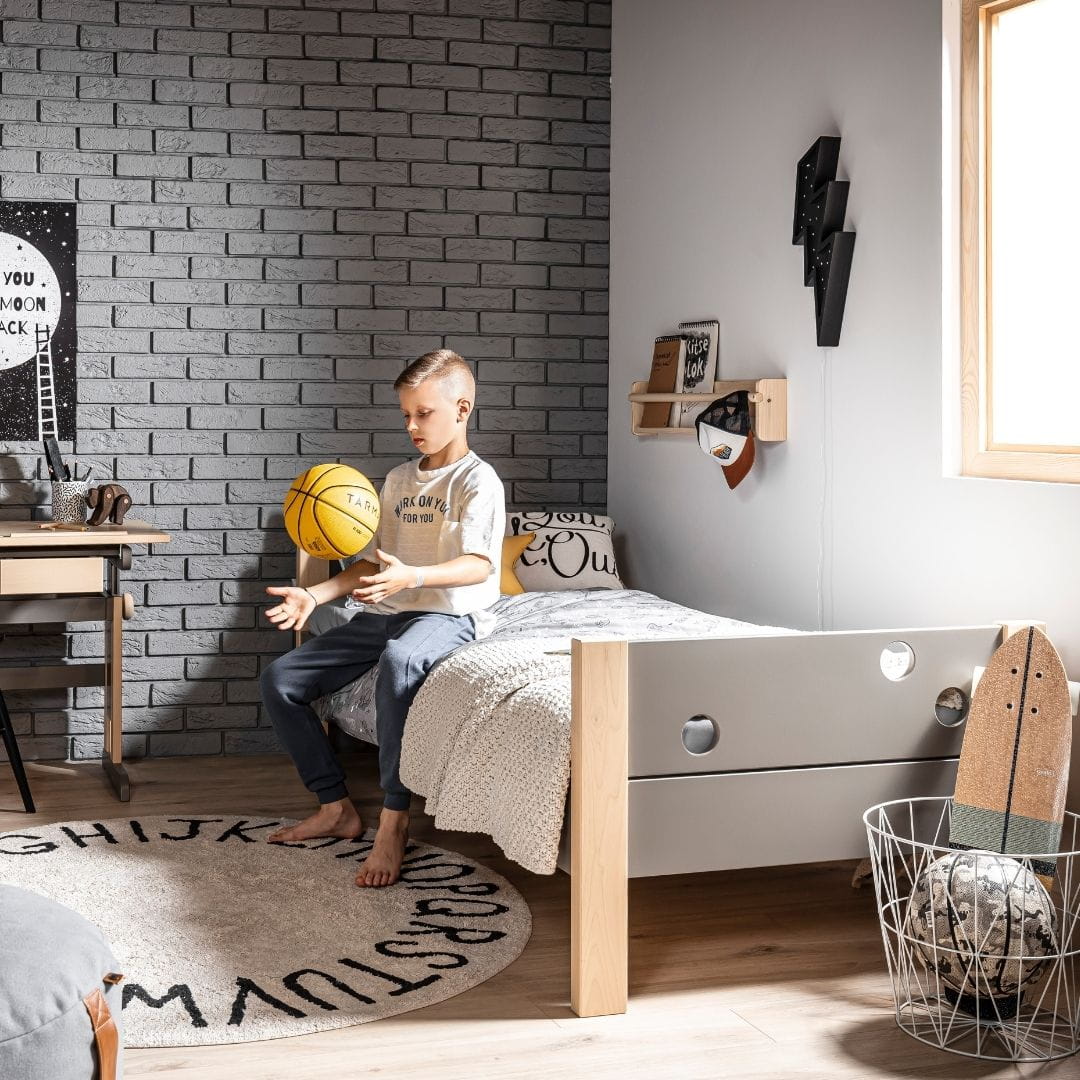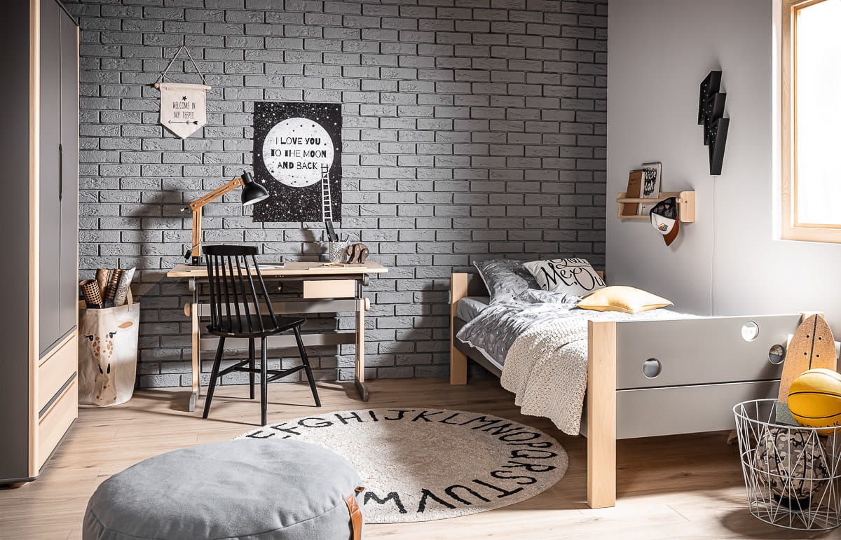 Prosty i piękny w formie wzór doskonale wpasuje się w każdy pokój, zarówno mniejszej pociechy, jak i nastolatka. Ponadczasowe połączenie szarego koloru i jasnej brzozy będzie pasowało do każdego dziecięcego wnętrza.
