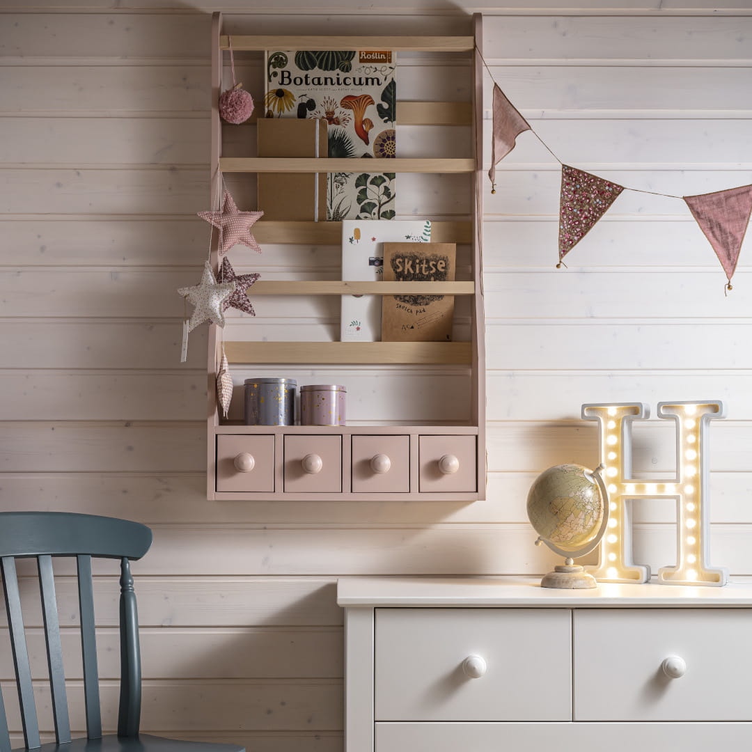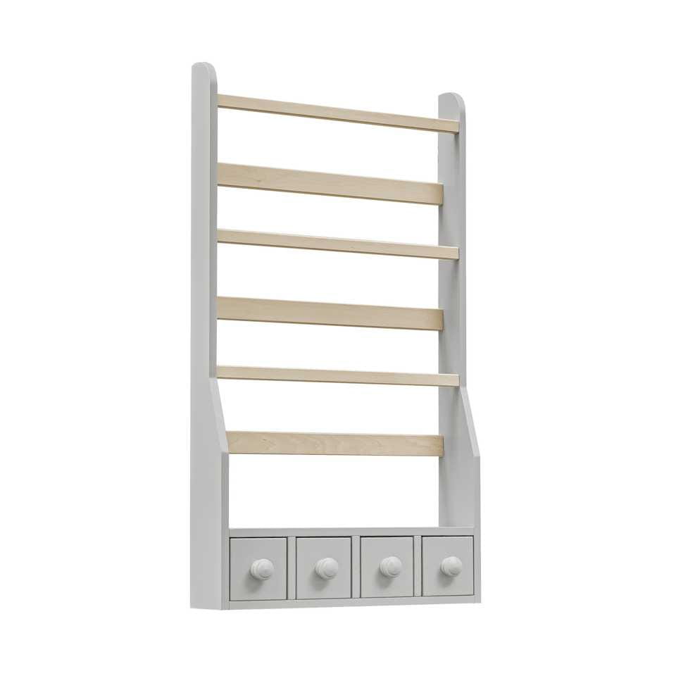 Trzy praktyczne półki i szuflady z drewnianymi uchwytami. Piękna i praktyczna półka do pokoju dziecka dostępna w czterech kolorach zapewni doskonałe miejsce do ekspozycji książek, oraz dodatkowe miejsce w szufladach idealne na najcenniejsze skarby.