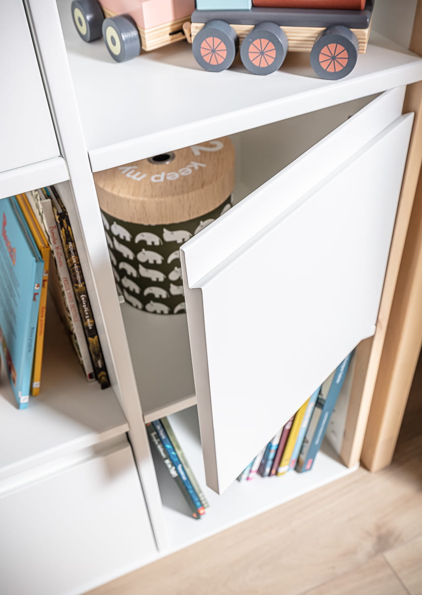 Przestronne półki pomieszczą wszystkie skarby malucha, pomagając w uporządkowaniu przestrzeni i sprawiając, że zabawki i książki będą w zasięgu ręki dziecka, co pozwoli na samodzielne sięganie i odkładanie ich na miejsce.