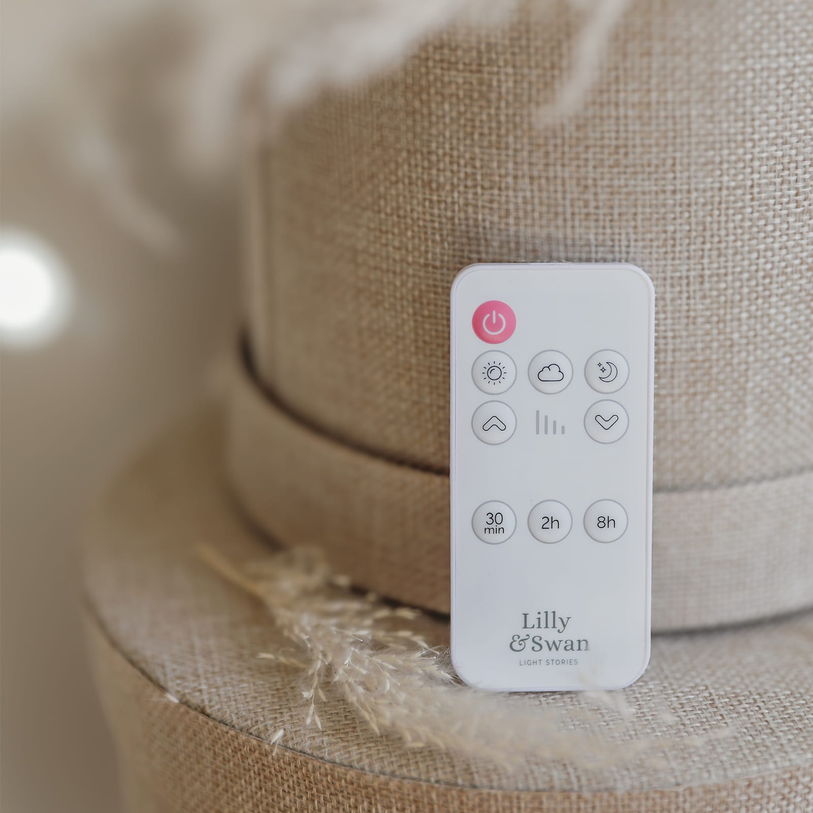 Zastosowane źródło światła – energooszczędny pasek linear led - umieszczony został w taki sposób, aby nie raził w oczy. Światło jest ciepłe i miękkie – idealne do stworzenia przytulnej, wyciszającej atmosfery. Każda lampka Lilly and Swan wyposażona jest w dziecinnie prosty w obsłudze pilot. Dzięki wbudowanemu dimmerowi (ściemniaczowi) można z łatwością dostosować natężenie światła do aktualnych potrzeb: od najmocniejszego, wystarczającego do wieczornego czytania, po bardzo delikatne, które może towarzyszyć dziecku podczas usypiania lub nawet przez większość nocy, nie zakłócając snu. Przygaszony tryb świecenia będzie także pomocny podczas nocnej opieki nad najmniejszymi z dzieci, zaś starszym dzieciom zapewni bezpieczną orientację w ciemności. Jednym kliknięciem można również ustawić określony czas świecenia lampki (30min, 2h lub 8h), po którym wyłączy się ona automatycznie.