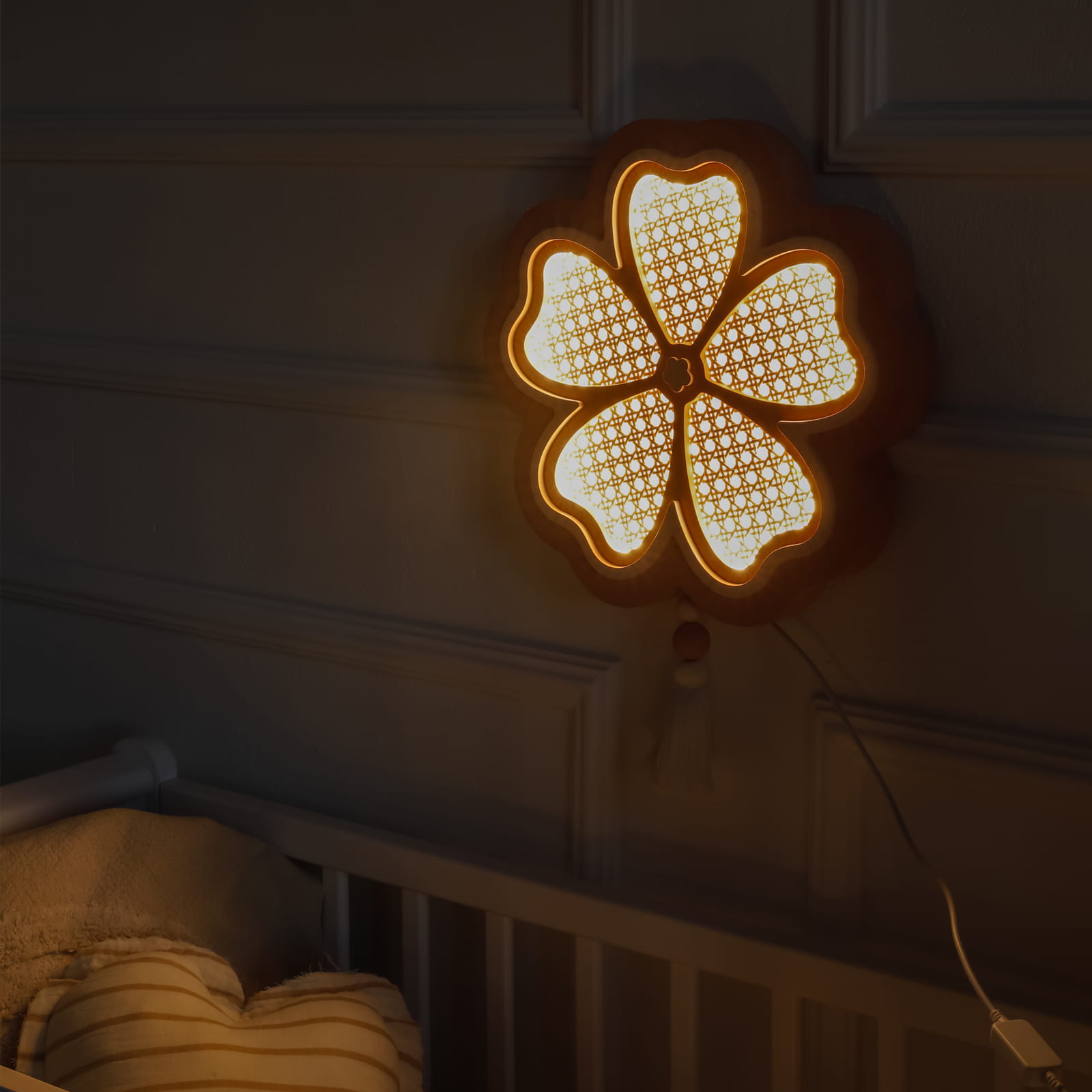 Delikatny, rattanowy kwiat roztacza w pokoiku miękką poświatę i wprowadza bajkowy klimat – idealny do wieczornego wyciszenia, wspólnego czytania i spokojnego snu. To idealna lampka nocna do pokoju dziecka, która jednocześnie pełni funkcję dekoracyjnej ozdoby ściennej.
