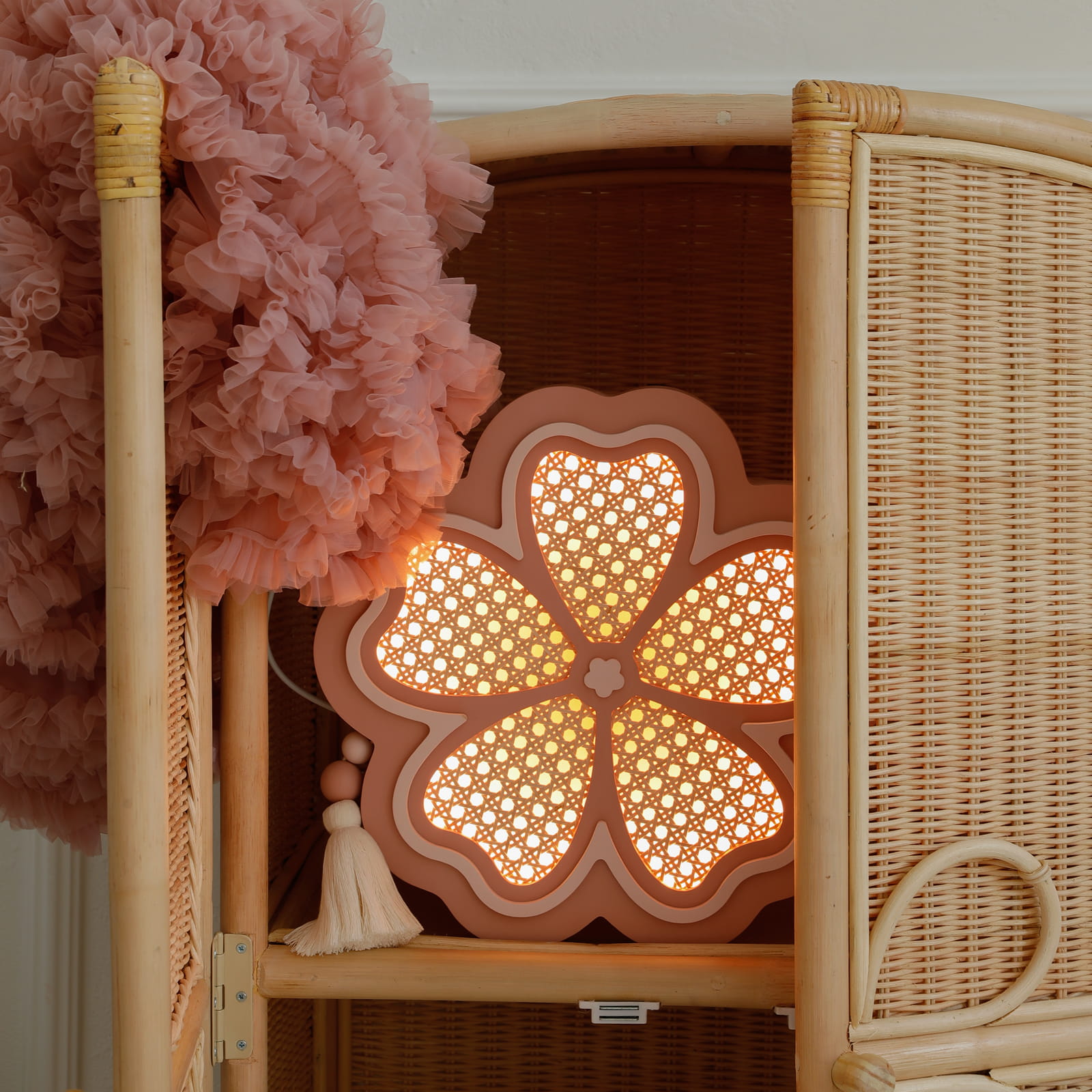 Lampka dziecięca Lilly & Swan – kwiatek z rattanem na ścianę do pokoju malucha