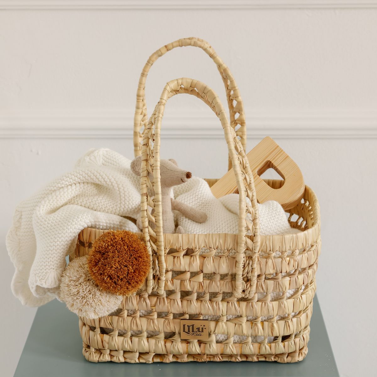 Poznaj uroczy, ręcznie pleciony kosz z naturalnych liści palmy, ozdobiony dwoma miękkimi pomponami w odcieniach karmelu i wanilii. Lekki, poręczny i estetyczny, został zaprojektowany z myślą o codziennym porządku i pięknie naturalnej przestrzeni.